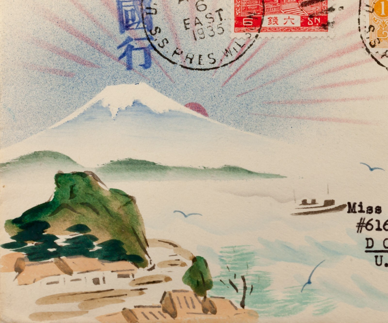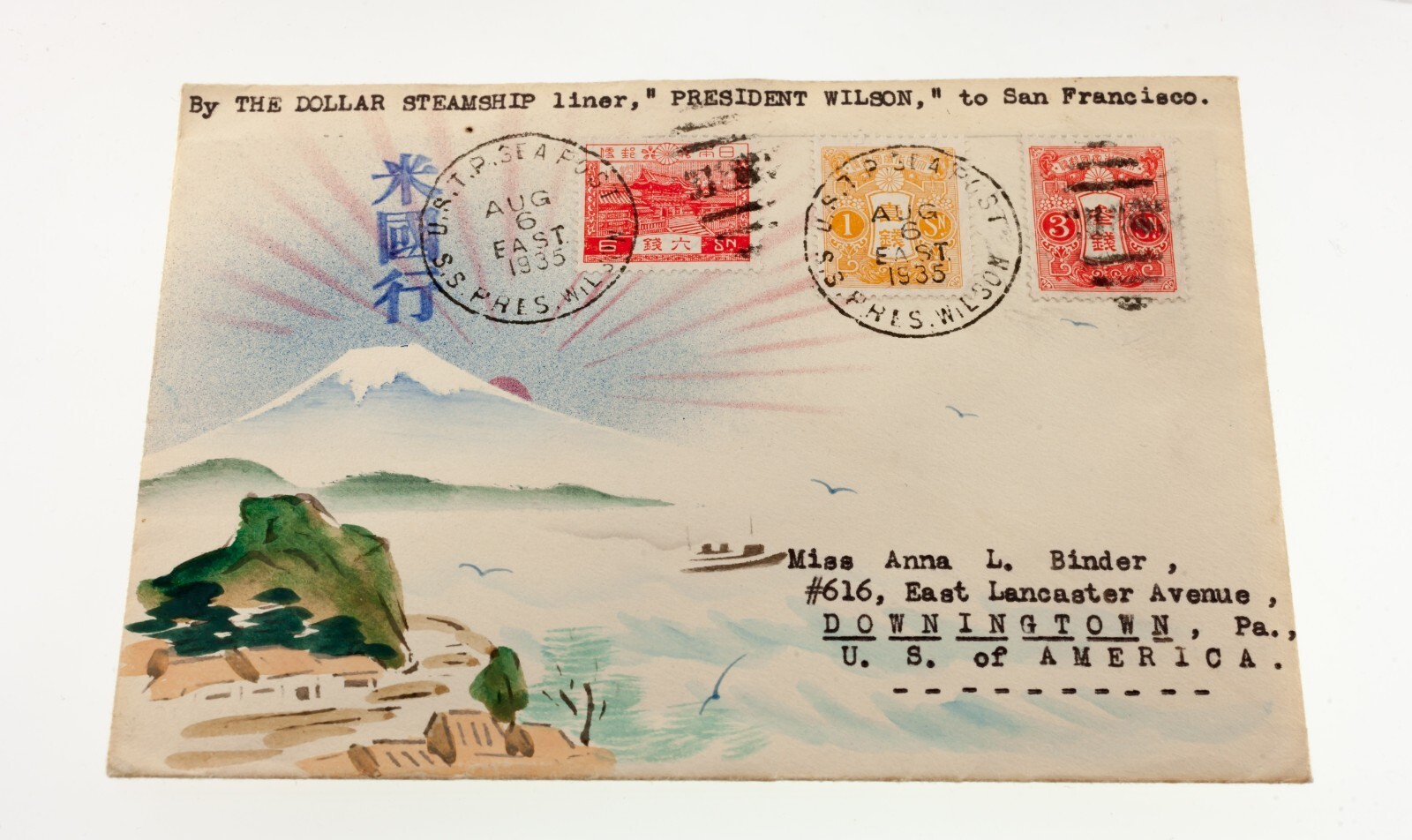Karl Lewis 1935 handbemalte Aquarellabdeckung Japan nach PA, USA Prez Wilson C-15