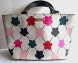 Elevate your accessory collection with the Kate Spade New York Juno Grant Street Tote. This charming purse, featuring a vibrant multicolored floral pattern, is a stylish blend of function and fashion. With a rectangular shape and ample storage, it's designed to suit any occasion, from business meetings to casual outings or even cocktail parties. Crafted from durable grainy vinyl with a coated finish, the tote boasts a spacious interior lined with a soft beige jacquard fabric. The gold-plated hardware adds a touch of elegance. The tote includes a variety of pockets to keep your essentials organized, along with a mobile phone pocket and inner pockets for added convenience Condition: Good preowned Front has some marks on it. Inside very clean like new condition. Please see photos to help with the description. Kate Spade New York Style: WKRU2677 Material: Grainy Vinyl, leather handles Color: Cream/black multi with gold tone hardware Approximate Dimensions (H x L x W): 8"H x 9.5"L x 4.5"W Approximate Strap/Handle drop: 4.5" handle drop Retail $228.00ce. With double handles and a comfortable handle drop, it's perfect for everyday use or travel.