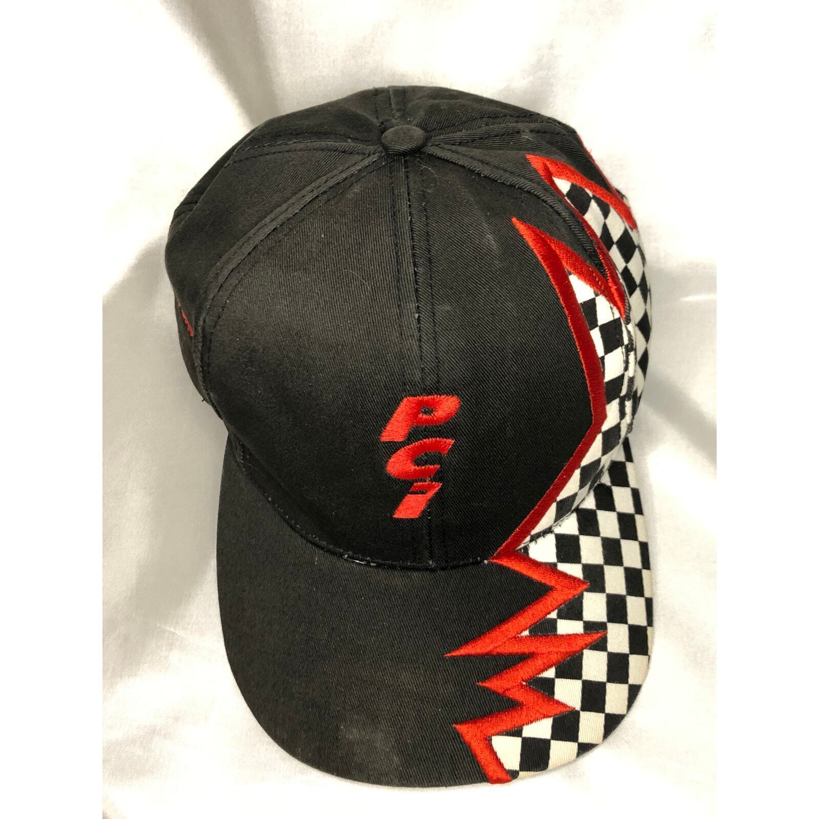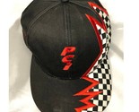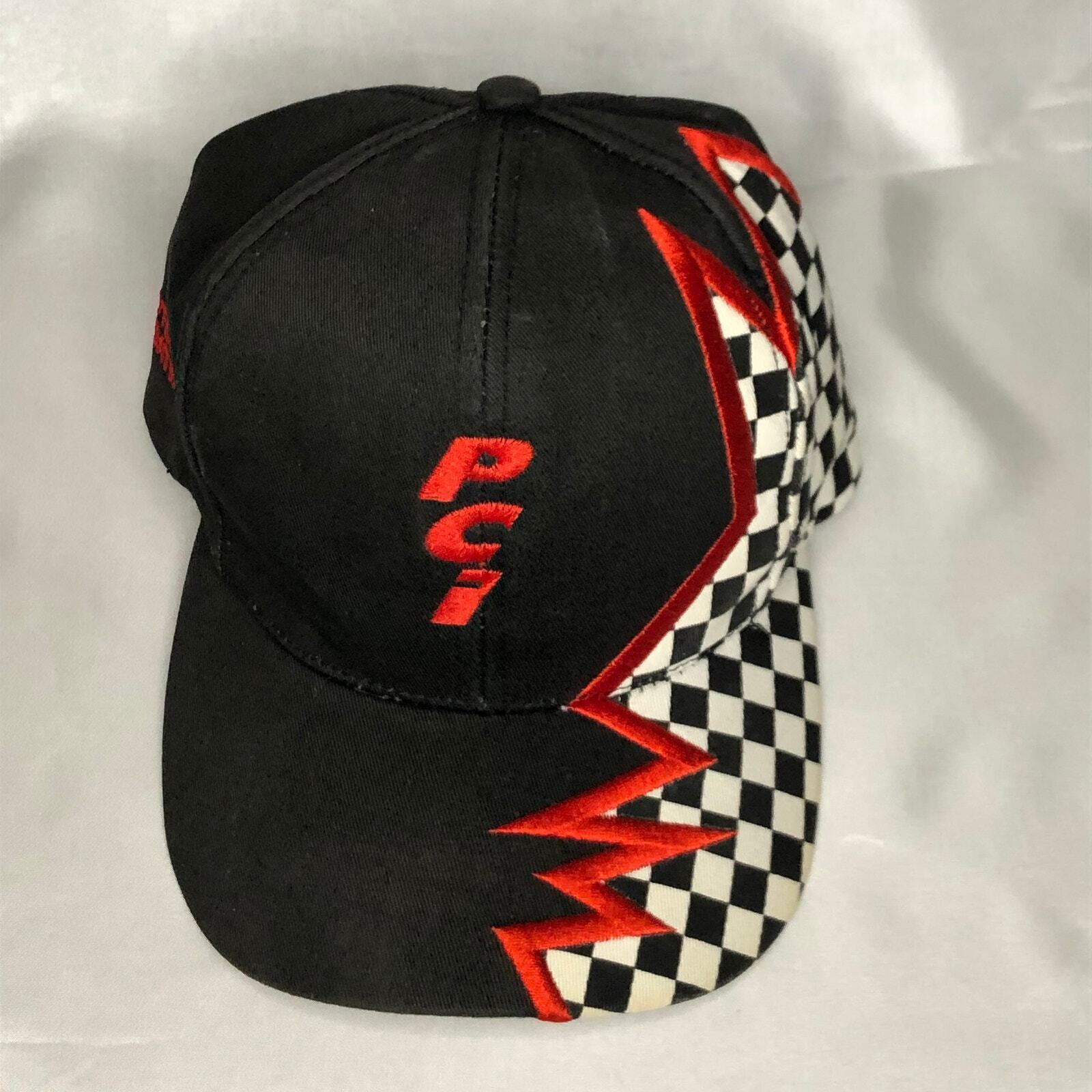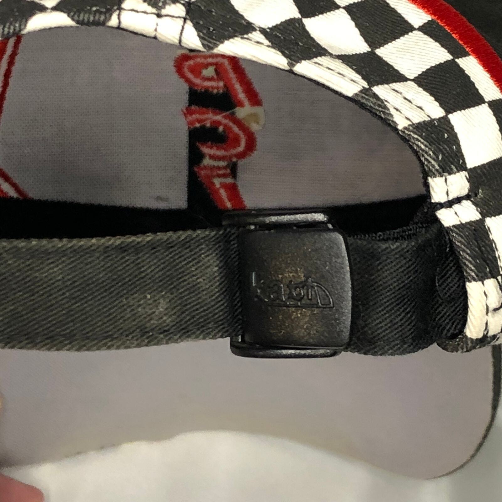 Kati Sportcap Mens PCI Racing Buckle Adjust Ball Cap Hat One Size Black ball cap with black white racing checkered/squares Embroidered red lightening bolt Embroidered red PCI patch Embroidered 'Protective Coating' on side Back adjust buckle with Kati logo Inside label information: Kati Sportcap One size fits alll Made in China