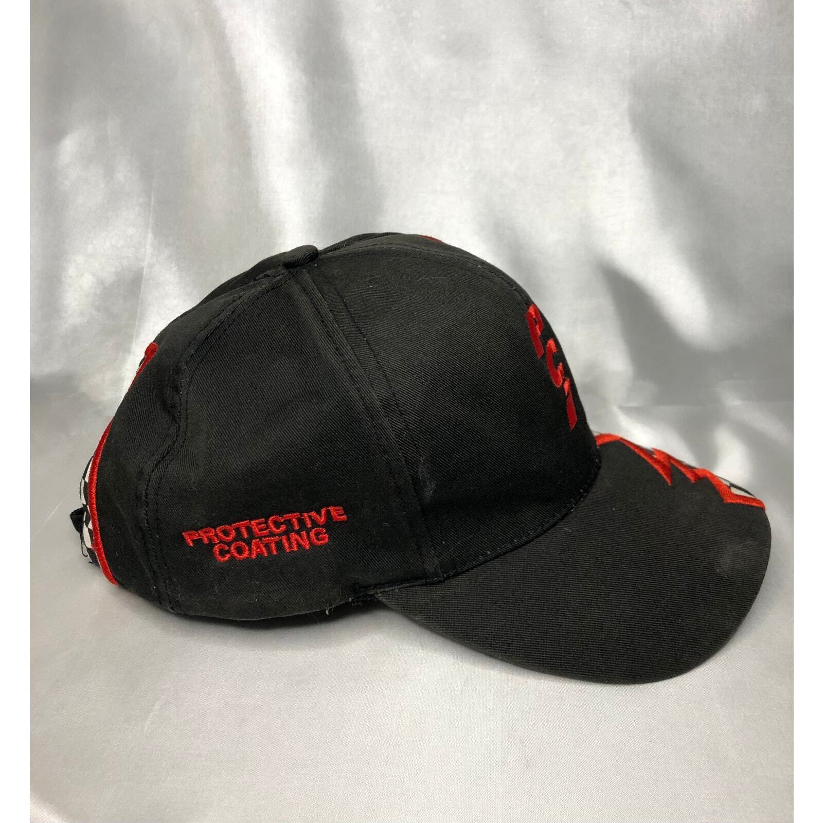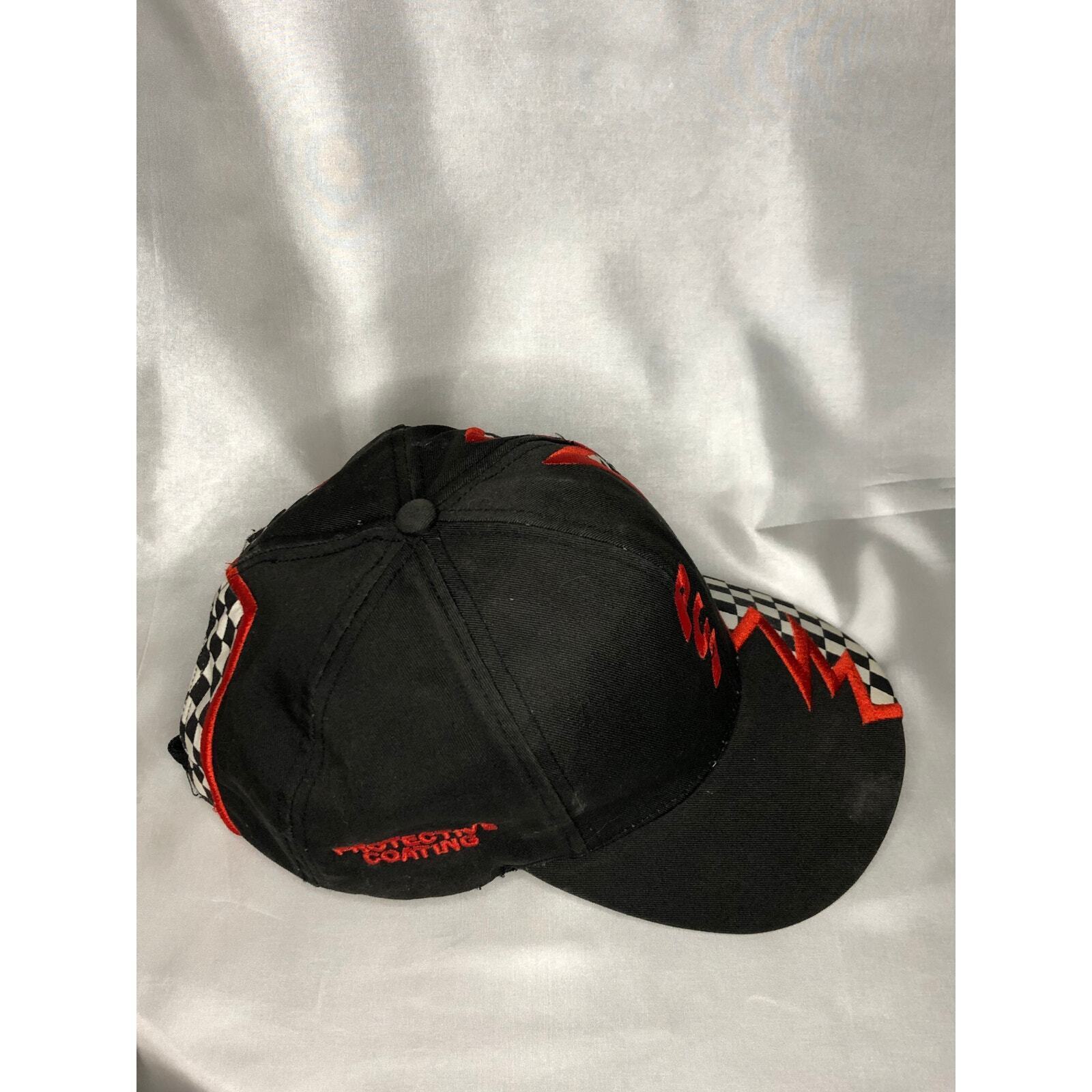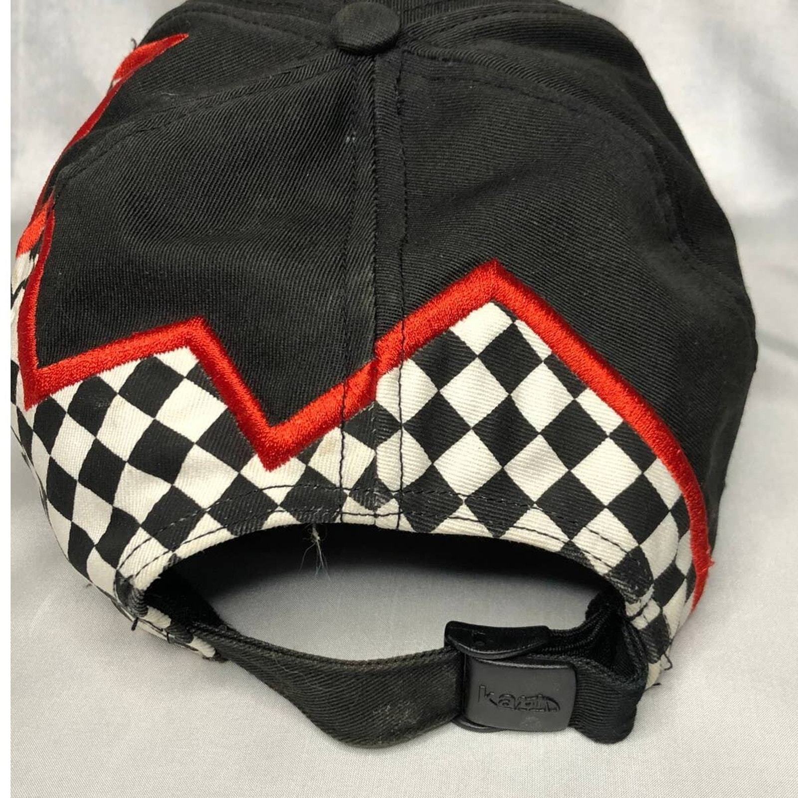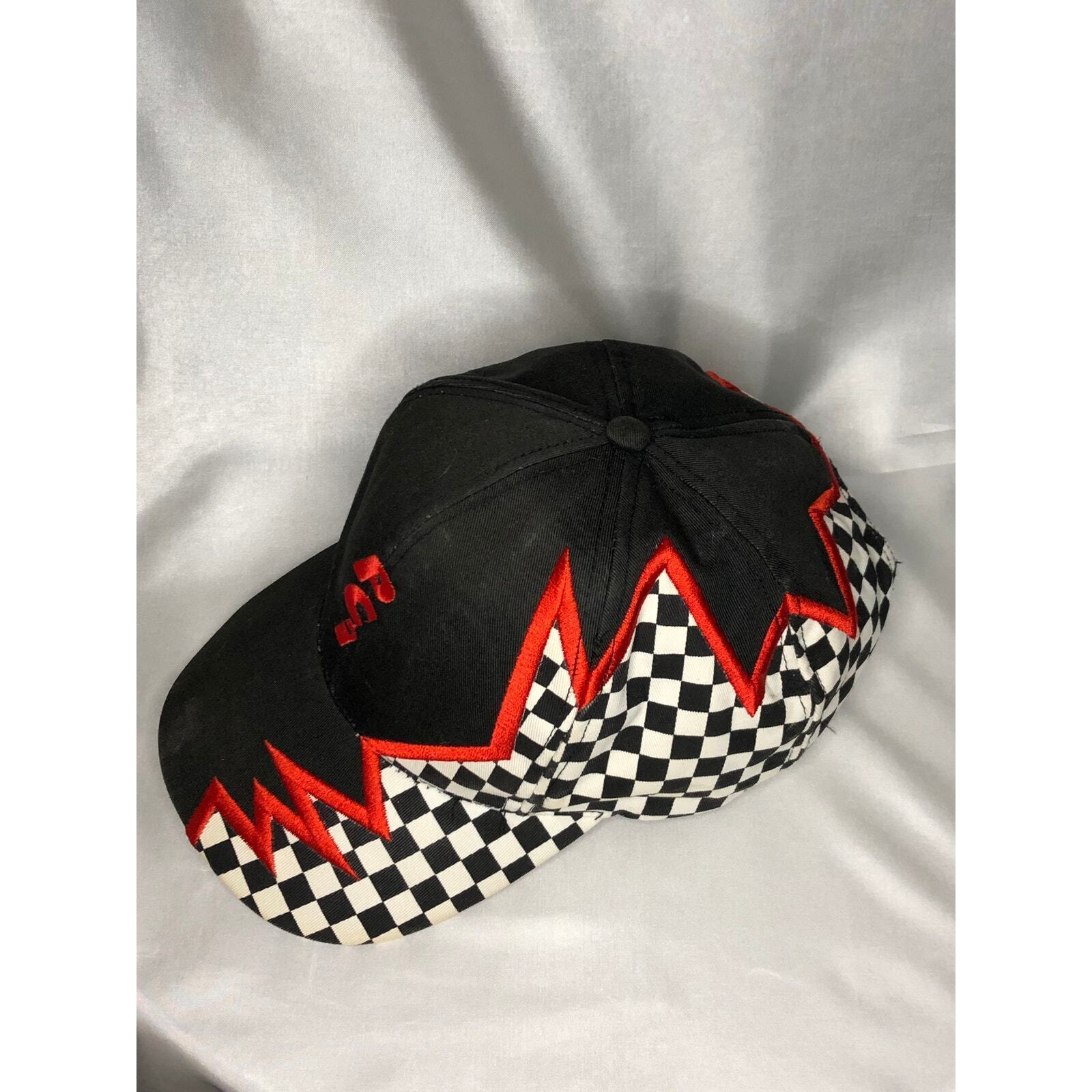 Kati Sportcap Mens PCI Racing Buckle Adjust Ball Cap Hat One Size Black ball cap with black white racing checkered/squares Embroidered red lightening bolt Embroidered red PCI patch Embroidered 'Protective Coating' on side Back adjust buckle with Kati logo Inside label information: Kati Sportcap One size fits alll Made in China