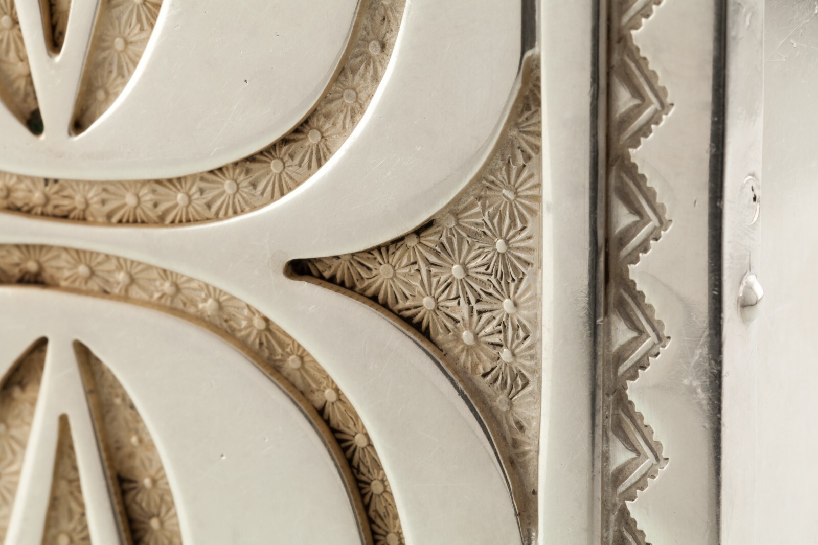 Verfügt über ein sauberes, elegantes Design, das auf optimierten Formen basiert, die wiederholt wurden, um ausgewogene und harmonische Muster zu bilden. Ein Stil, der mit Navajo Waving verglichen wurde