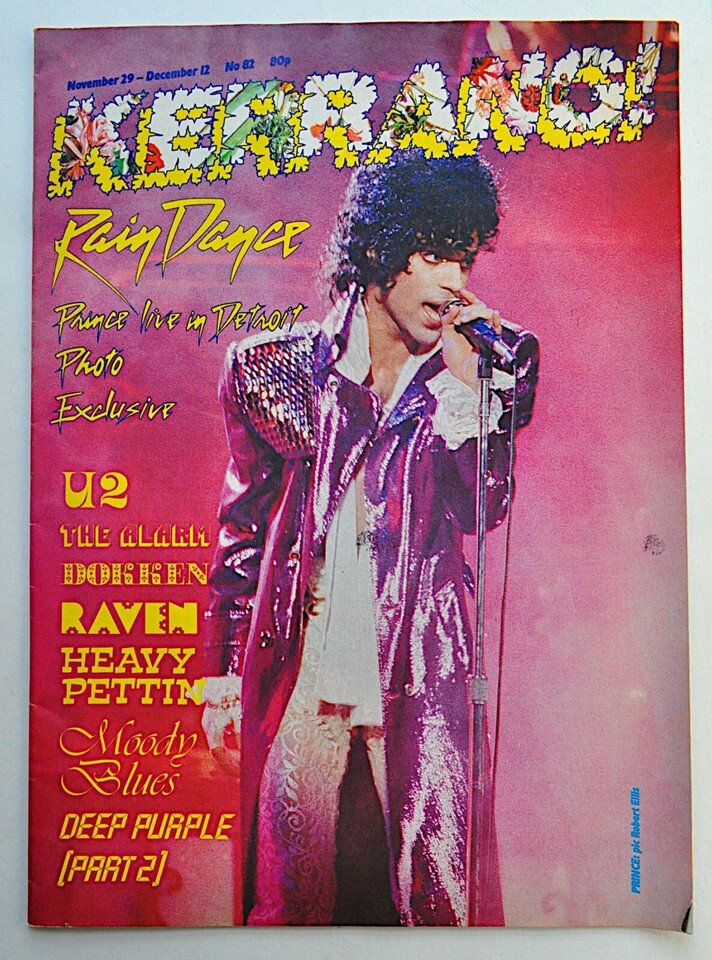 Kerrang! #82, Nov 29 - Dec 12 1984. Prince on the cover, two-page centerfold Prince pinup (with more Prince on the back of one page and Roger Glover on the other,) plus four more pages of Prince photos text, including a rundown of his Detroit show. Also features: Ritchie Blackmore (including a one-page pinup) and Roger Glover, Lionheart, Dokken, and Justin Hayward. Plus album show reviews (U2 The Alarm, among others), classifieds (are these personals even real??), ads, and even a brief review of Ghostbusters where the writer is annoyed that Akroyd made a comedy instead of a horror flick! ? Absolute time capsule, this.
