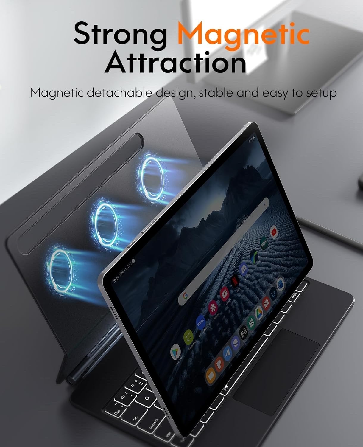 ?Floating Cantilever Magnetic Stand?: The CHESONA for Samsung Magic Keyboard features a hovering magnetic setup with strong magnetic suction. It can turn your tablet into a laptop instantly. The aluminum alloy hinge design provides strong stability for the tablet. The super large angle seamless adjustment provides you with a perfect viewing angle. Great for study, work, and traveling.