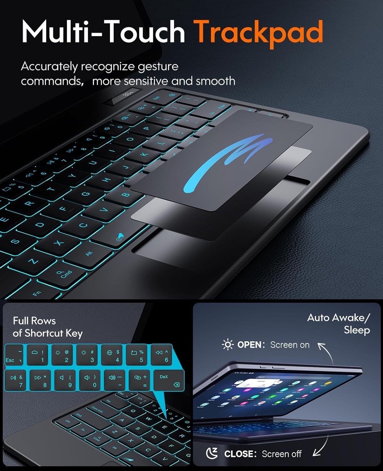 ?7-Color Backlight with Shortcut Keys?: 7-Color backlight and 3 kinds of brightness adjustments are illuminated in a dim environment to achieve a comfortable typing experience. Add some one-touch shortcuts that perfectly match the galaxy tab tablet system to effectively adjust volume, the brightness, open the search bar, take screenshots, and more.