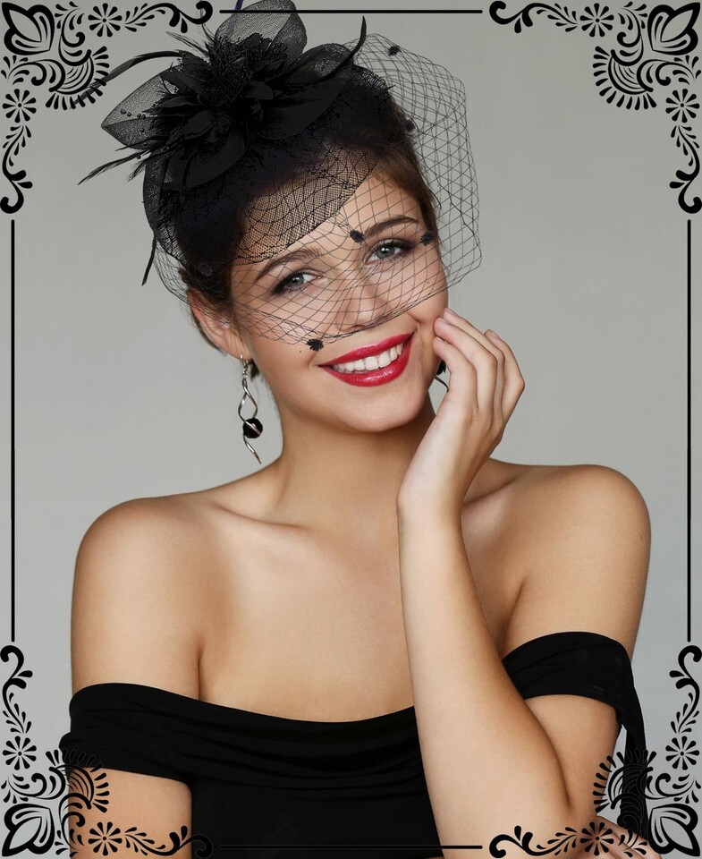 Kidukso Fascinators Hat Vintage 1920s Derby Mesh Veil Feathers Black