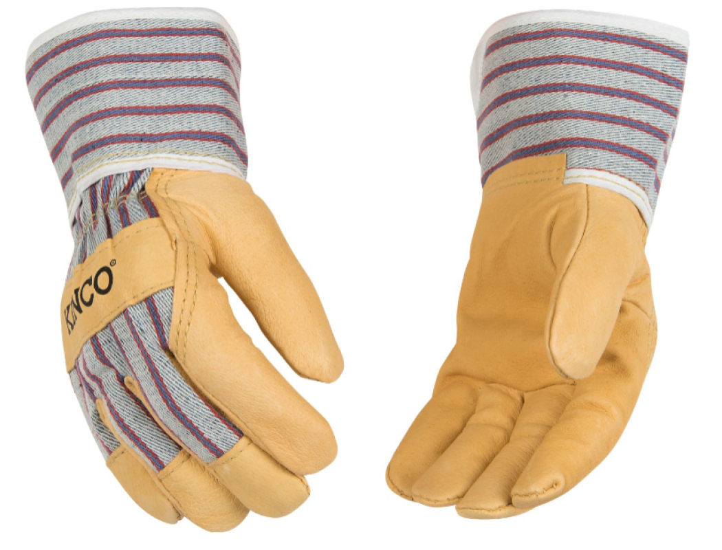Trademarked Otto striped cotton-blend canvas fabric back-of-the-hand and cuff offers lightweight and breathable coverage Tan grain leather palm of these protective gloves shields the hand with exceptional durability Starched cotton-blend canvas fabric safety cuff with shirred elastic wrist guards the wrist from outside elements and helps to deflect debris when layered over long sleeves Flexible wing thumb design is seamless between the palms and thumbs of the leather work gloves and offers additional flexibility and comfort Leather welt at the high-contact base of the middle and ring fingers reinforces seam strength and durability Leather palm extending to the wrist offers additional inner-wrist protection to reduces stress and damage to the seam Pieced cotton-blend canvas fabric hem incorporates an added piece of material to create a finished look and prevent fraying Pigskin knuckle strap on the Kinco youth leather gloves provides added protection from bumps and abrasions Wrap-around index finger design creates increased durability and comfort to ensure that the high-rub areas on the exterior of the finger are not compromised by potential thread or seam failures Golden suede pigskin patches at the distal end of the fingers provide a protective barrier around the fingernails and fingertips to reinforce the base material and seams for added wear Gunn cut pattern allows for fewer seams between the fingers, reduces the exposure of seams in high-wear areas of the palm, and allows the back-of hand base material to remain seamless for longer wear and comfort Shirred elastic also tightens the shell material to the shape of the hand above the widening of the palm Youth leather gloves color: Tan