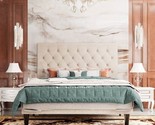 - King Size Beige Linen Upholstered Platform Bed with Button-Tufted Headboard