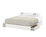 This King size Modern Platform Bed with Storage Drawers in White Finish has a timeless look and blends easily in any dcor. Provides storage with 2 large drawers, 1 on each side, equipped with ball-bearing full-extension drawer slides. Economic choice since it does not require a box spring. Weight capacity is 500 lbs. Can be attached to the headboard (3107290) for a complete kit. Also available in Chocolate or Pure Black finish. The interior drawer dimensions are 32-1/4-inch wide by 19-1/4-inch front to back. Measures 76-inch wide by 79-3/4-inch long by 10-1/4-inch high. Delivered in 2 boxes: BOX#1: 47-3/4 in. by 21 in. by 6-1/2 in., 107 lbs.; BOX#2: 46 in. by 21-1/2 in. by 5-3/4 in., 100 lbs. The top surface of the platform bed is laminated. Mattress and accessories not included. New and improved drawer bottom made with wood fibers. Manufactured from certified Environmentally Preferred laminated particle panels. Complete assembly required by 2 adults. Approximate assembly time: 1:45. Tools are not included. 5-year limited warranty. Made in Canada.