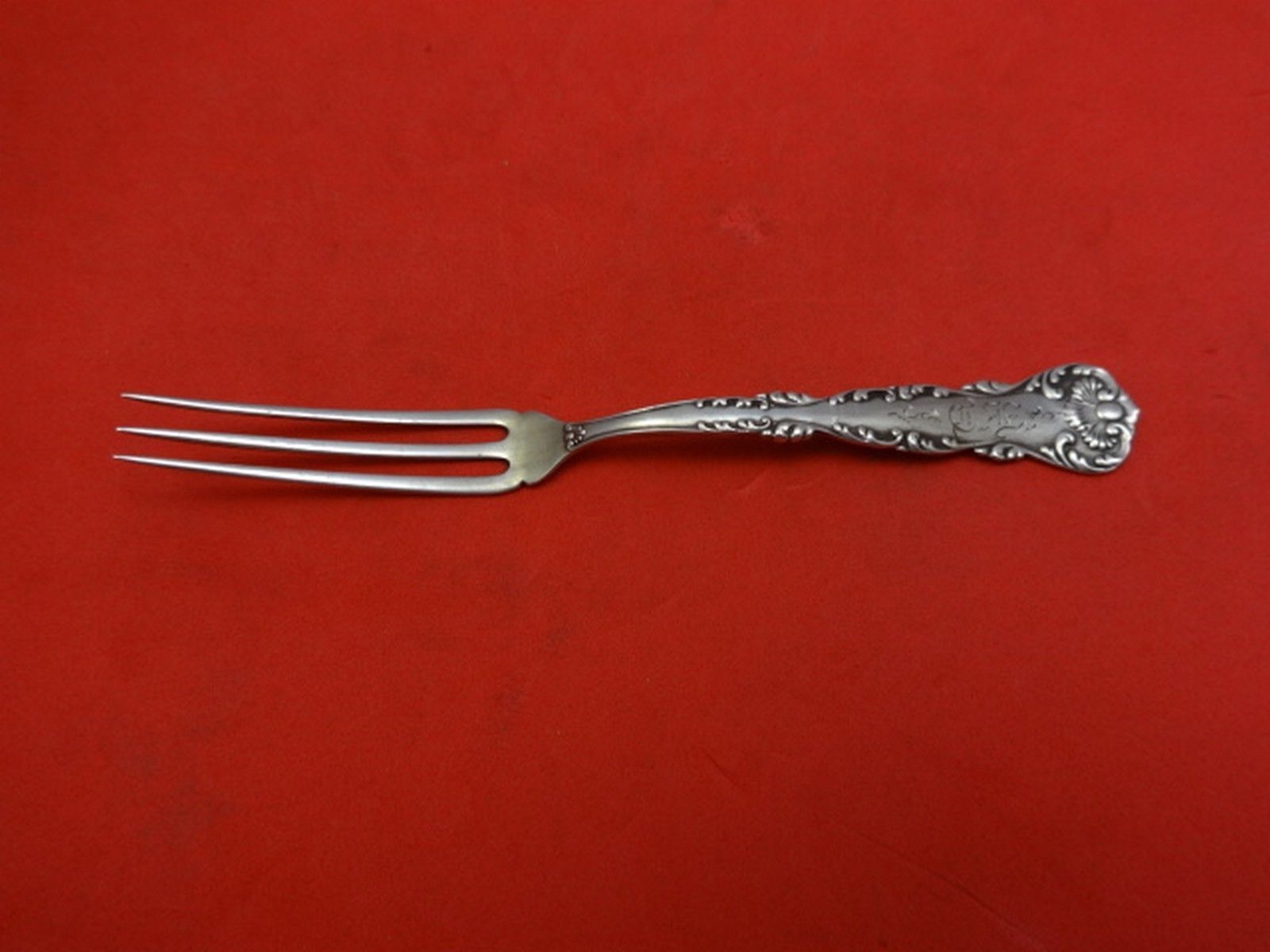 Sterling Silver STRAWBERRY FORK 4 3/4" in the pattern KINGS COURT BY FRANK WHITING. It is monogrammed (MONOS VARY) and is in excellent condition.