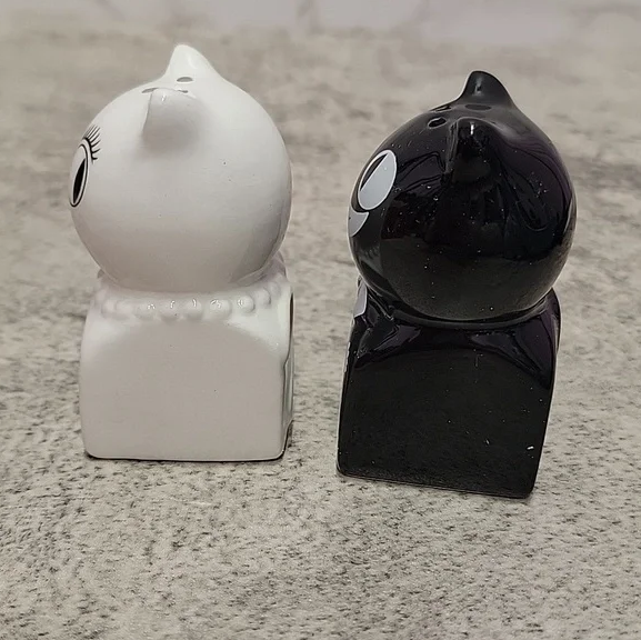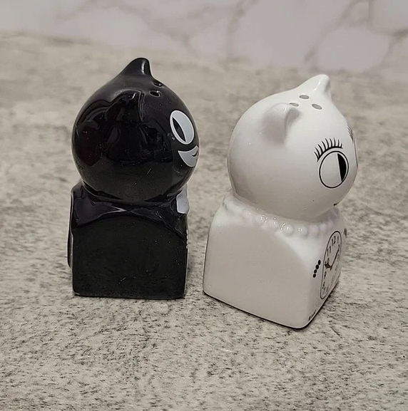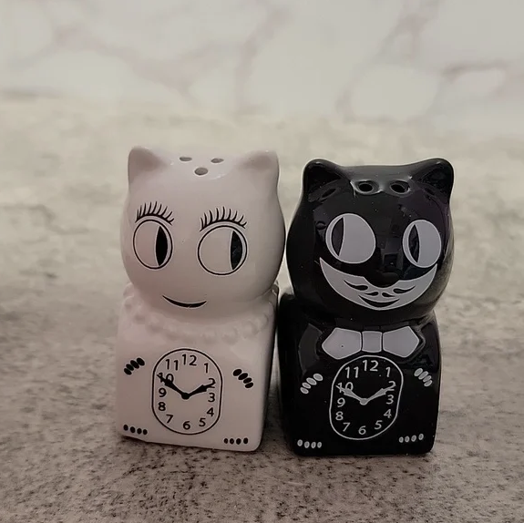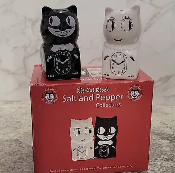 New in box, a set of genuine Kit Cat Klock brand collectible salt and pepper shakers featuring Mr. Mrs. Kit Cat Klock in black and white ceramic material. These are hand painted Black, Pepper Dapper black gentleman cat. White, salt Elegant white lady cat. Hand-Painted: Intricately crafted ceramic painted by hand. Officially licensed by the Kit Cat Klock California Clock Company. Not to be confused with Felix the cat, Kit Cat has been around for about 93 years and is an American Icon!