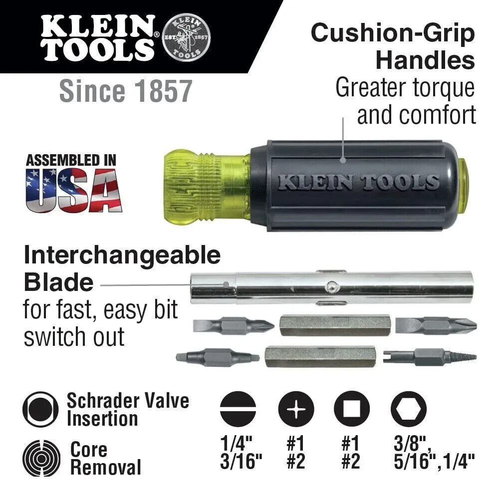 - Klein Tools Multi-Bit 11-in-1 Screwdriver/Nut Driver with Schrader Valve Core