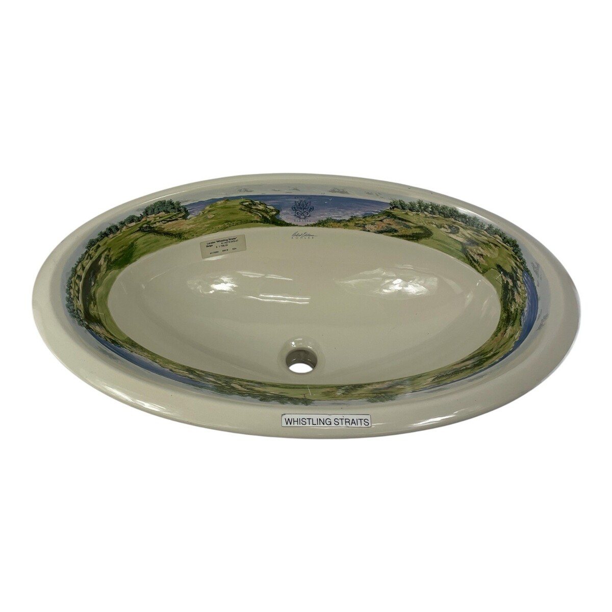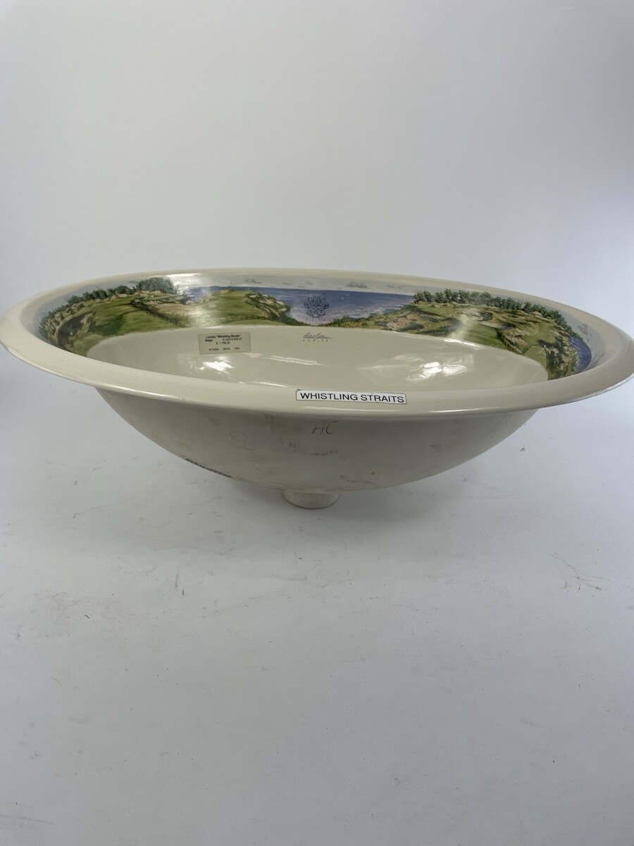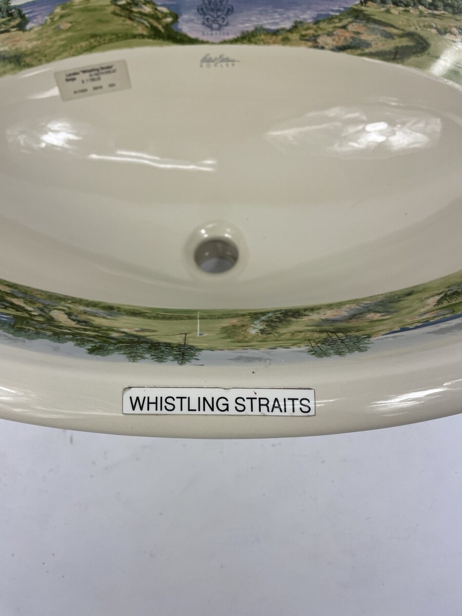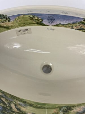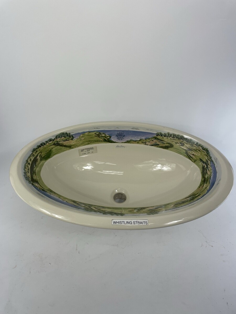 Depicting sweeping panoramas of Whistling Straits golf course and Lake Michigan beyond, this design celebrates the art of golf in the historic style of renowned late 19th-century British artist Douglas Adams. The colorful artwork embellishes a Centerpiece sink, which features a unique wide-beveled ledge and generous basin size. Decorated with panoramic views of Whistling Straits golf course on Almond background Oval basin No faucet holes; requires wall- or counter-mount faucet Coordinates with other products with the Whistling Straits design DISCONTINUED VERY RARE Demo model from Showroom 2 small black marks as per photos ACQUIRED FROM A CONTRACTOR IN MONTREAL CANADA . The contract got canceled by customer