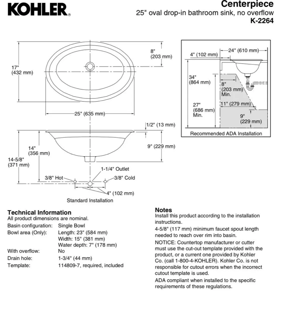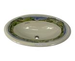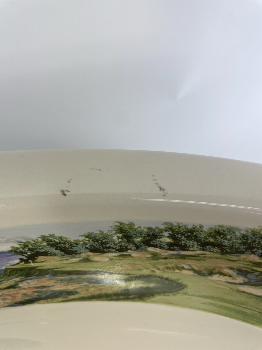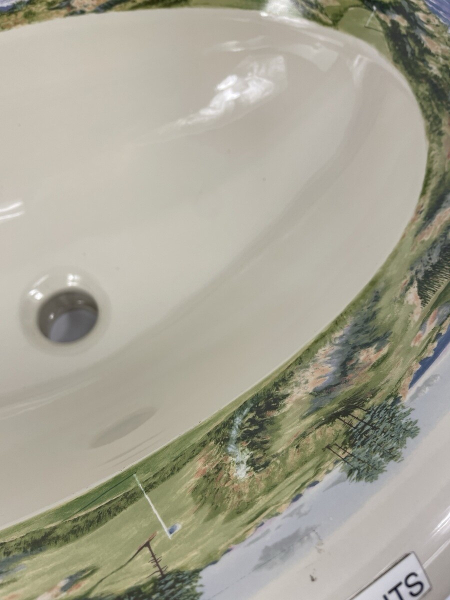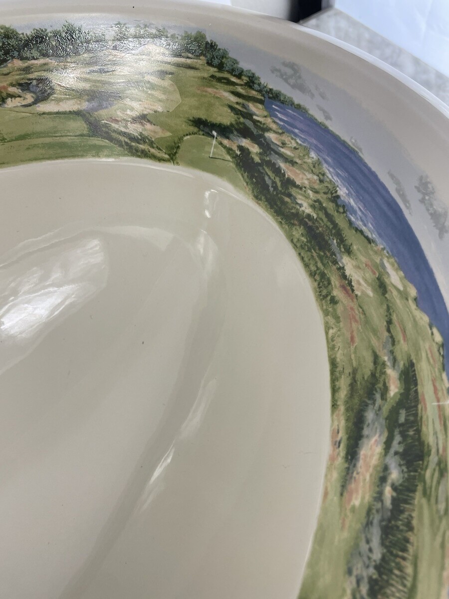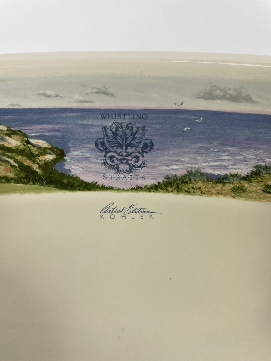Depicting sweeping panoramas of Whistling Straits golf course and Lake Michigan beyond, this design celebrates the art of golf in the historic style of renowned late 19th-century British artist Douglas Adams. The colorful artwork embellishes a Centerpiece sink, which features a unique wide-beveled ledge and generous basin size. Decorated with panoramic views of Whistling Straits golf course on Almond background Oval basin No faucet holes; requires wall- or counter-mount faucet Coordinates with other products with the Whistling Straits design DISCONTINUED VERY RARE Demo model from Showroom 2 small black marks as per photos ACQUIRED FROM A CONTRACTOR IN MONTREAL CANADA . The contract got canceled by customer