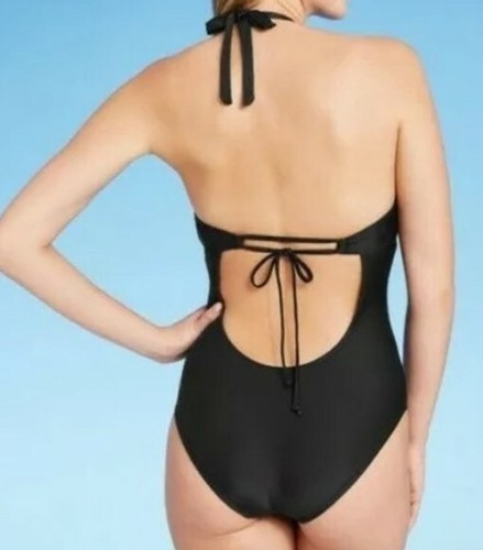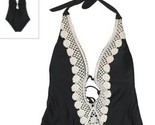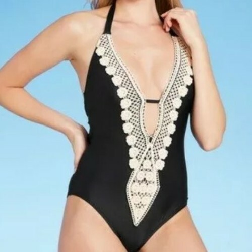 This sale is for a Kona Sol? One-Piece Swimsuit Women's Size Extra Small (XS) 0-2 Model ~ Black/AF5660 Crochet detailing trim Plunge neckline Deep scoop back with straps across Slender neck (halter) straps Removable cups for customizable modesty/coverage shaping Lightweight fabric with added spandex for flexible movement fit Shell is 80% Nylon ~ 20% Spandex Lace ~ 100% Cotton Body Lining is 100% Polyester Swimsuit is brand new with tags Please view photos for a good description of this swimsuit Thank you!