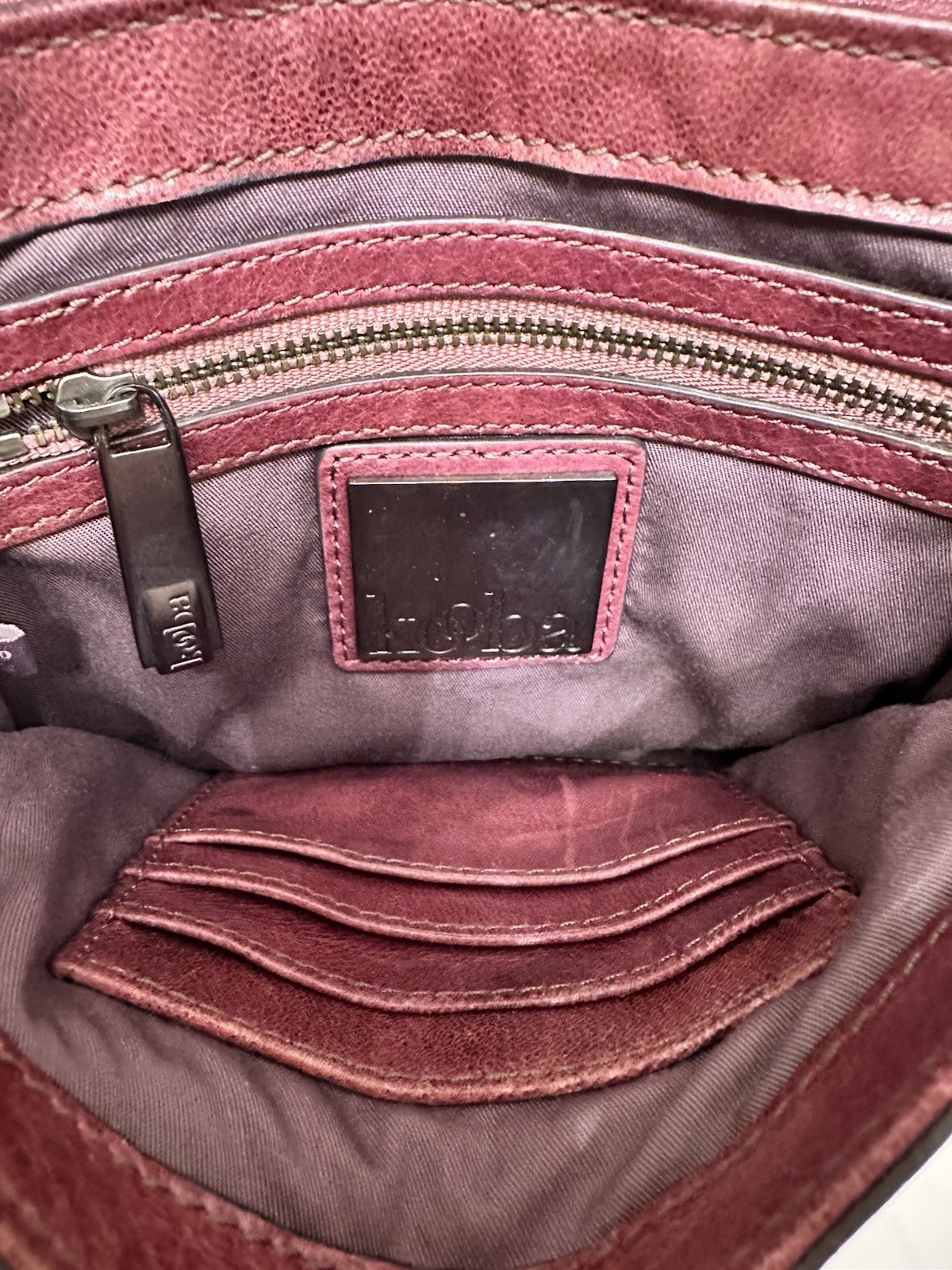 Very good pre owned condition. Some patina to the corners. Quality leather crossbody. The color is light plum.