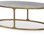 This table blends a traditional feel with contemporary design cues. Antiqued texturing on the frame has the look of timeworn, hand-forged metal. A tempered glass top with a faux marble finish provides a refined contrast. Chic when hosting decor or holding entertainment essentials, this table rounds out your living room with transitional flair. Korajane - Antique Gold - Oval Cocktail Table48.0"W x 27.38"D x 17.5"H - 39.0 lb Korajane - Antique Gold - Round End Table20.0"W x 20.0"D x 22.63"H - 16.0 lb