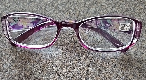 This Sale is for One (1) Pair of Ky018 Reading Glasses +3.50 Strength Glasses PD ~ Pupillary Distance 62-64 Solid PURPLE frame front Multicolored flower design temples Acrylic frame Lens Width 52mm Lens Height ~ 32mm Bridge Width 21mm Temple Length 136mm Frame front measures approximately 5.6" wide Anti-Blue Light ~ Reduces Eye Strain Fatigue While Reading High-quality ~ lightweight ~ comfortable reading glasses Polished temple Oval shaped frames Reading glasses are new ~ never worn Please view photos for a good description of this item Thank you! *****Presbyopia is a natural phenomenon linked to aging of the eyes, which diminishes the vision from age 40-45 onwards