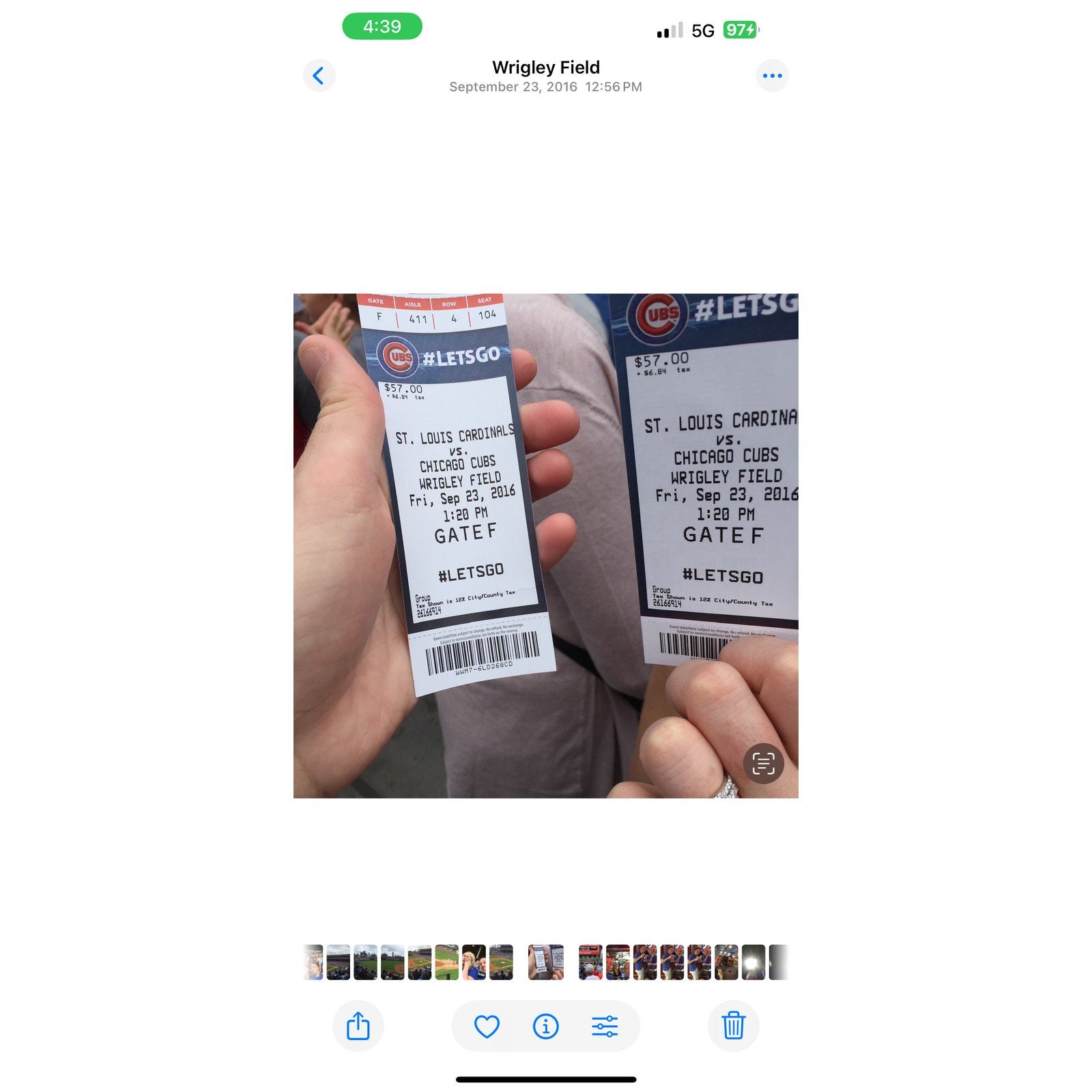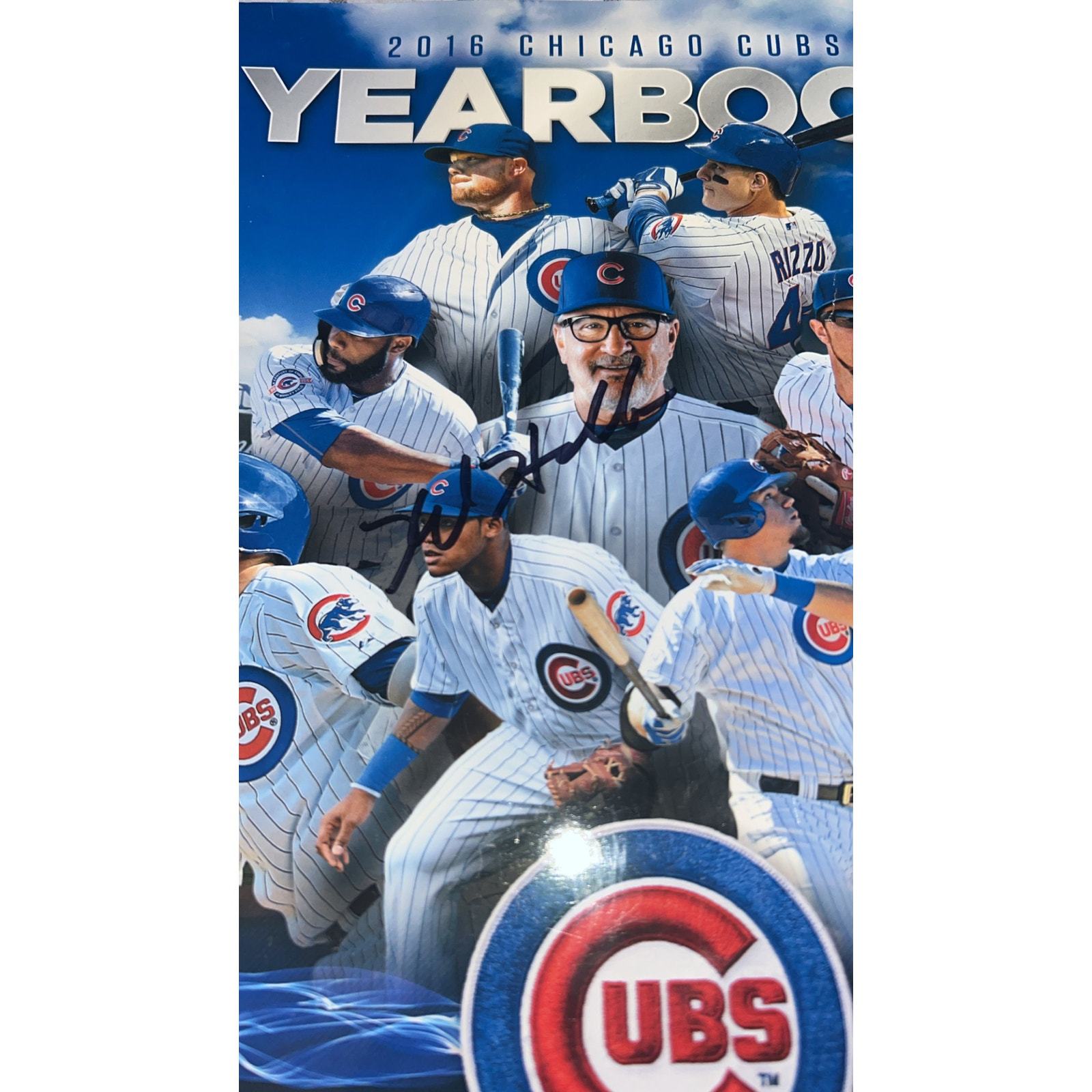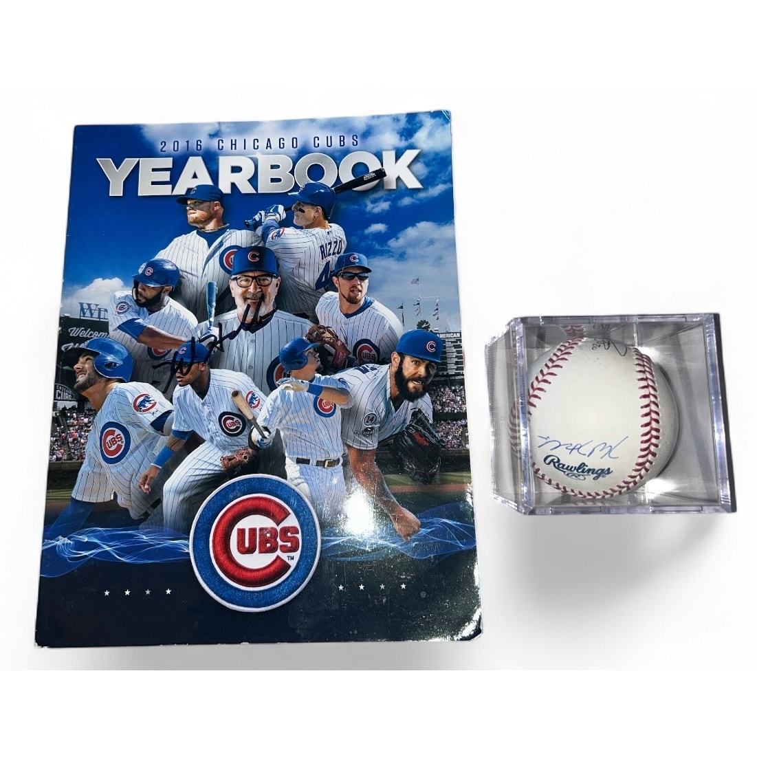 This is for the 2016 Chicago Cubs Yearbook and a baseball my ex wife and I got on a trip out there. We had the VIP package and the player we got to meet was Matt Szczur (hurray?), so got his autograph on a baseball and the yearbook, not sure why he didn't sign it on his picture. Kyle Hendricks was signing autographs before the game and signed the baseball and snuck it in so he signed his picture in the Yearbook and then got down there again and had him sign it on the cover. So 3x "The Professor" autograph and 2 of Matt's. The last picture is our tickets for the 2nd game we went to and where we got the autos (not included). It's a nice memory but again not anything I need anymore so would want it to go to someone who would appreciate it more. Baseball is in great condition, Yearbook is in fair condition with dented up corners. But great memorabilia from their World Series year!