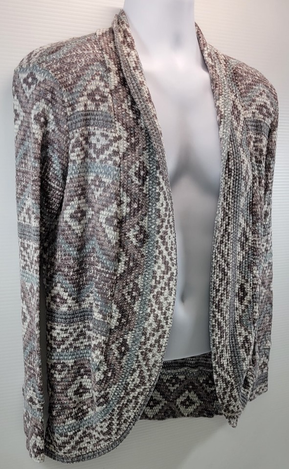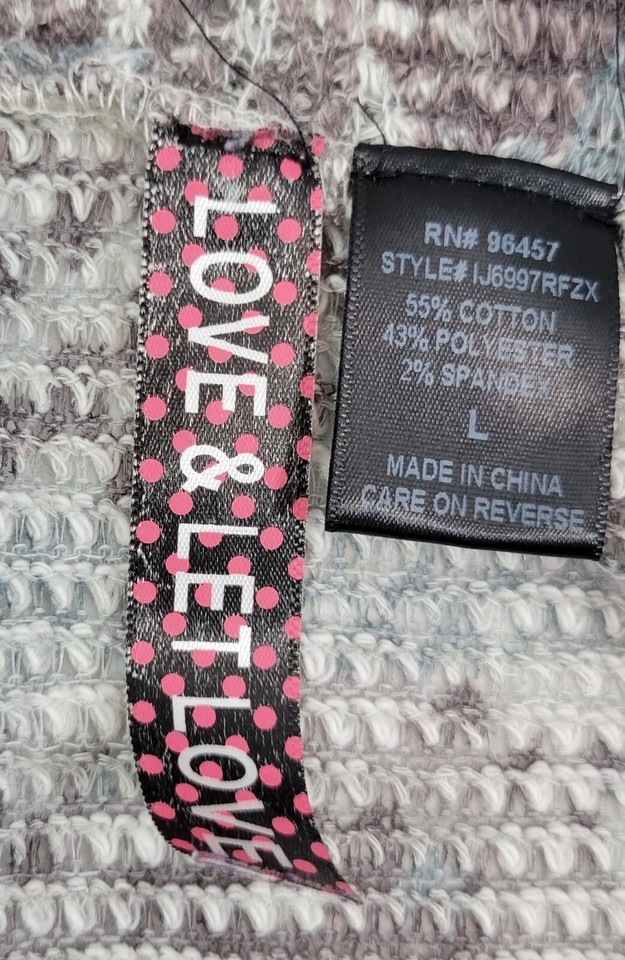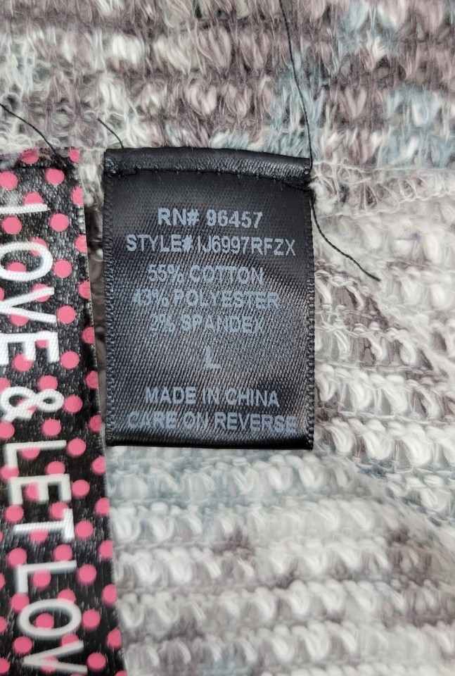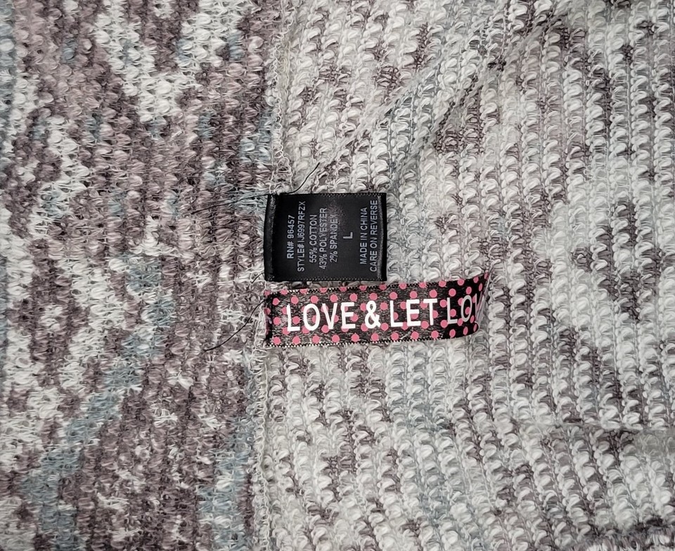 Women's Love Let Love Open Cardigan Sweater Large 55% Cotton 43% Polyester 2% Spandex Approximate measurements: Shoulder to sleeve cuff - 22" Armpit to sleeve cuff - 18" Top of shoulder to bottom back - 25" Sweater is in overall good used condition.