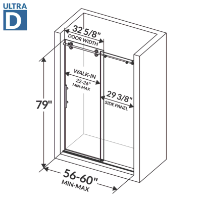 LessCare 56-60 inches W x 79 inches H Shower Door ULTRA-D collection. The Shower Door features 12mm (0.47 inches) clear tempered glass and Reversible installation for a right or left door opening.