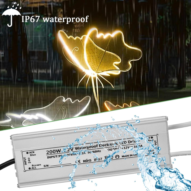 LED Driver 200 Watts Waterproof IP67 12V LED Power Supply Transformer Adapter, AC 90-120V to DC12V Low Voltage Output,