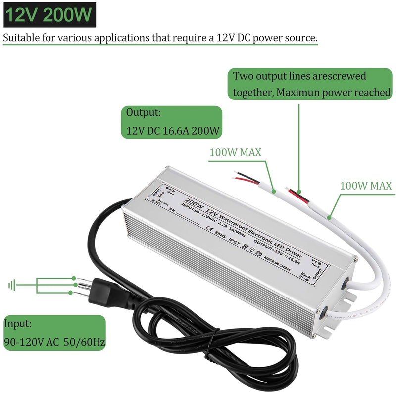 LED Driver Specification: Input: AC 90-120v 50/60Hz Output: DC 12V, 16.7A Wattage: 200W Working Temperature: -20? to +60? Working Relative Humidity: 20%-90%Rh Dimensions:8.6*2.7*1.6inch Waterproof: IP67 Input Efficiency: 88% Weight: 2.65 pounds