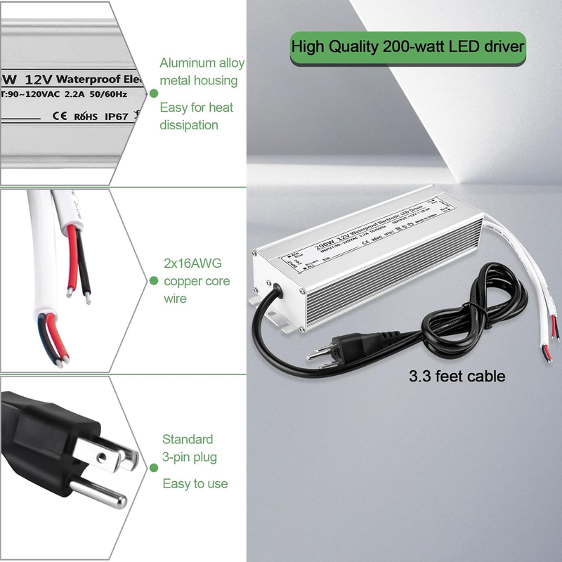 High-Quality 12 Volt Power Supply: This high-quality led power supply 12v 200W offers 100% waterproof protection with an IP67 rating for outdoor use. 12V led power supply 200W features an aluminum alloy metal housing, making it easy for heat dissipation and ensuring stability. 12V transformer adapter with 3-prong plug 3.3 feet cable, easy to use