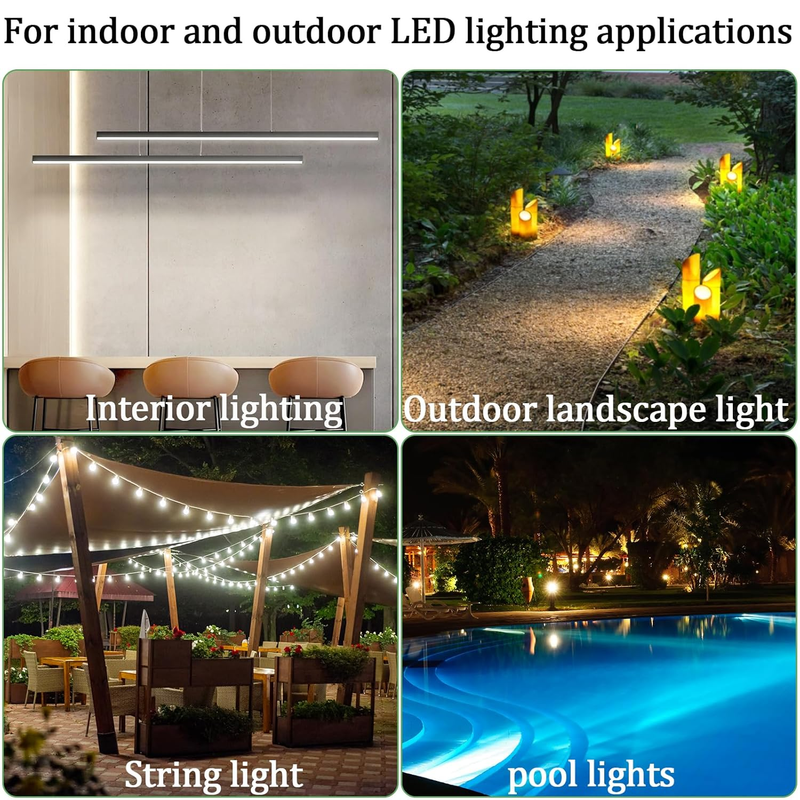 Suitable for various applications that require a 12V DC power source Compatible with single-color or RGB light strips, string lights, security cameras, landscape lights, speakers, billboards, LED signs, LED strip lights, LED landscape lighting, pool lights, and outdoor LED signs (?200W).