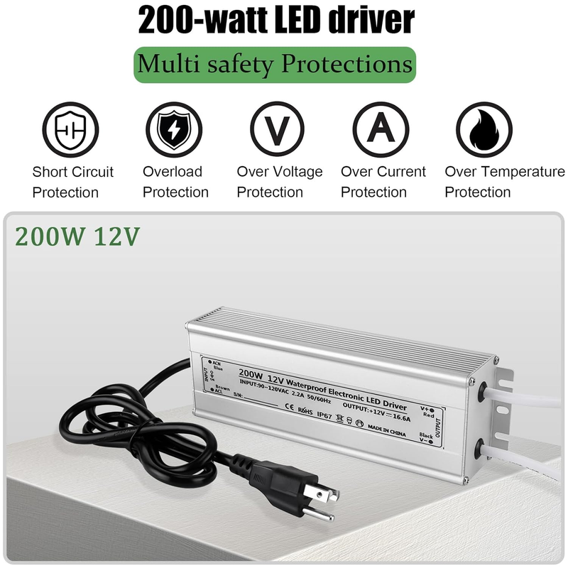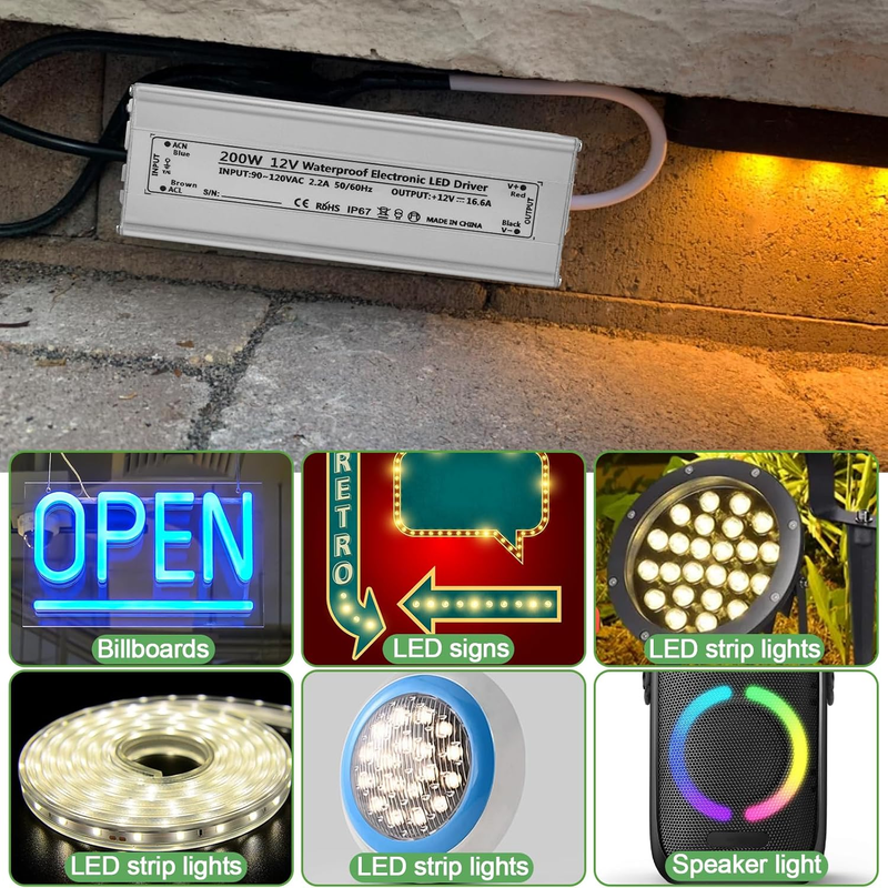 Wide Applications: This 200-watt LED driver 12v, a 12V LED power supply transformer adapter suitable for various applications requiring a 12V DC power source. It's compatible with single-color or RGB light strips, string lights, security cameras, landscape lights, speakers, billboards, LED signs, LED strip lights, LED landscape lighting, pool lights, and outdoor LED signs