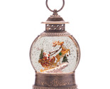 Bring the magic of Christmas to life with this LED Santa in Sleigh Snow Globe. Set inside a vintage lantern-shaped globe, this festive scene features Santa in his sleigh with a reindeer, surrounded by pine trees and swirling snowfall. Designed with classic red, green, and bronze tones, this enchanting holiday accent is illuminated by a built-in LED light, while the powered motor keeps the glitter in motion, mimicking a snowy winter s night. With a 6-hour timer function, this beautifully crafted piece is USB-powered (cord included) or operates on 3 AAA batteries (not included). Perfect for a tabletop, mantel, or shelf, this charming snow globe adds a nostalgic touch to any holiday decor.