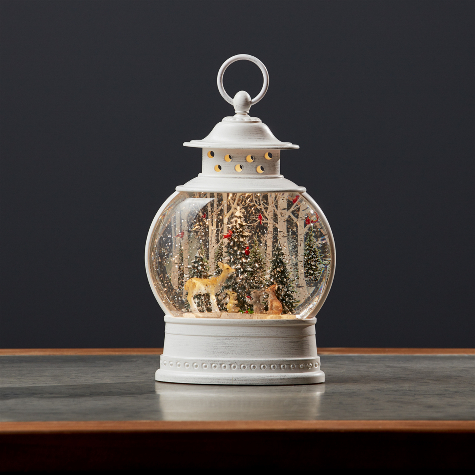 Bring the magic of a winter wonderland into your home with this LED Snow Globe Lantern with Woodland Deer Scene. This beautifully designed holiday accent features a charming snowy forest setting with woodland animals, encased in a classic lantern-style snow globe. Soft LED illumination enhances the swirling glitter, creating a mesmerizing effect perfect for festive decorating. Perfect for mantels, shelves, or tabletops, this Christmas snow globe operates with a 6-hour timer for effortless ambiance. Whether powered by 3 AA batteries (not included) or USB cord (included), this elegant decoration will enhance your Christmas celebrations for years to come.