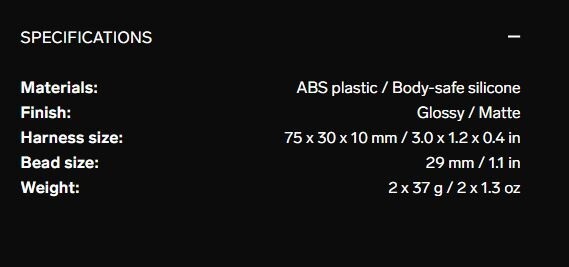 Two 29 mm beads ? each 37 g (1.3 oz) for a total of 74 g