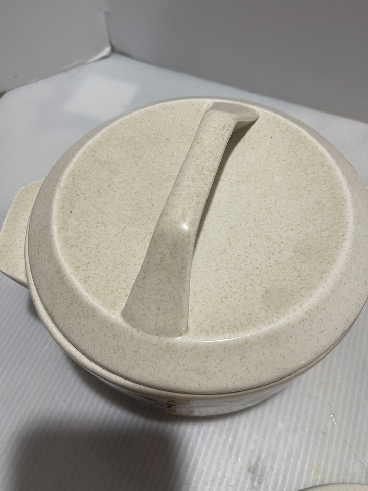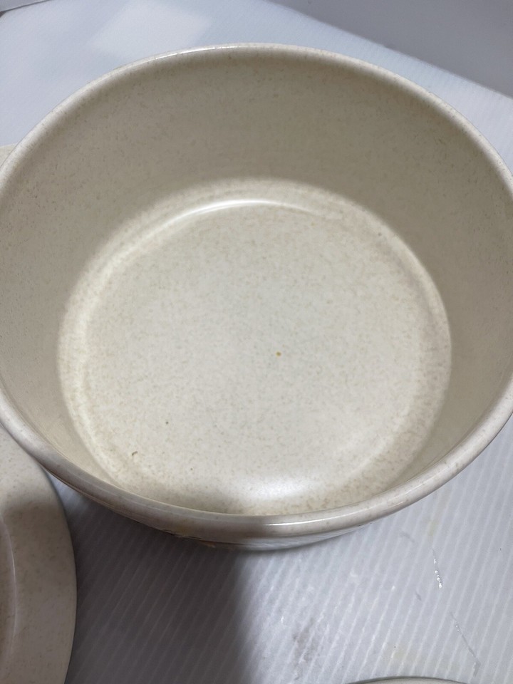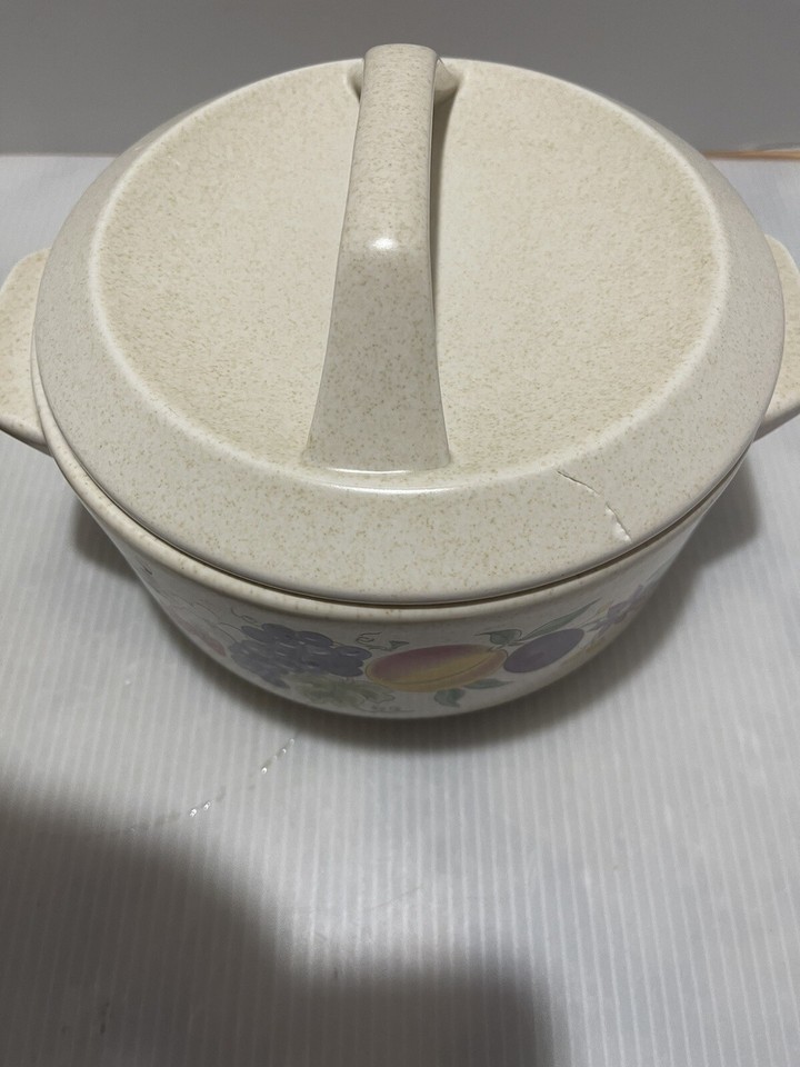 It is in good used condition; one lid has creaks and chips; see pictures. Some scratches from being used.