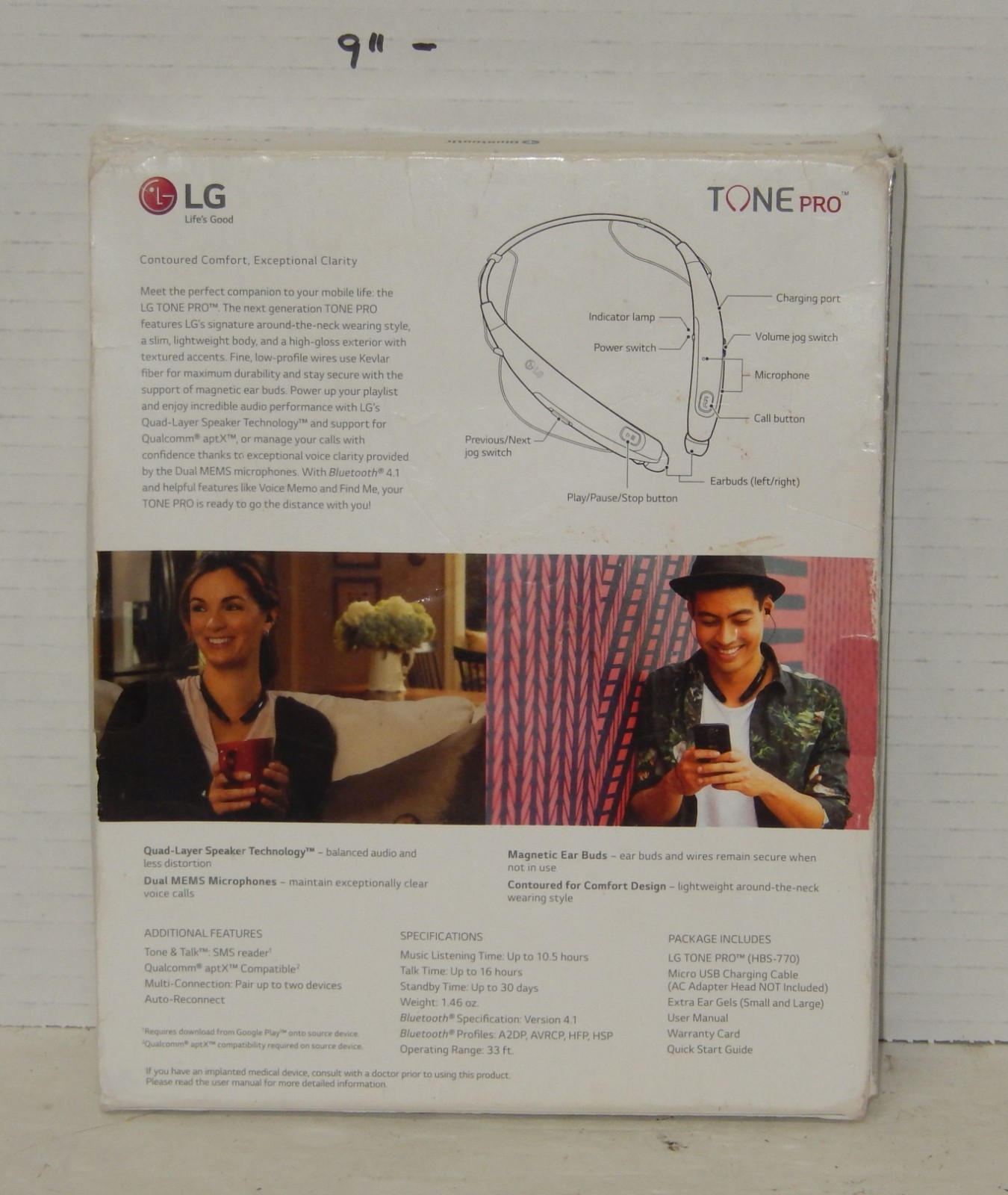 For Sale is a LG Tone Pro HBS-770 v2 Bluetooth Wireless Stereo In-Ear Headset Neckband. its in good used condition as seen in the pictures provided what you see is what you will receive. Please ask Any and All Questions prior to purchasing. Fast Same or Next day shipping with Free Delivery Confirmation within the U.S. Payment Due within 7 days of purchase (if you need more time please let us know In advance) we love to combine shipping is always a Yes and Most of the time Additional Items Ship for free.