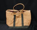 - LL Bean Canvas Khaki Green Leather Handles Boat Tote Plaid Flannel Lined Tan Bag