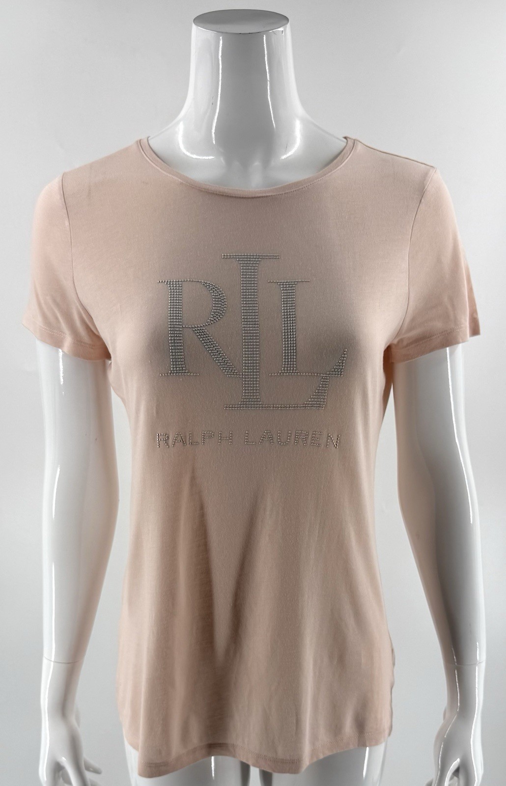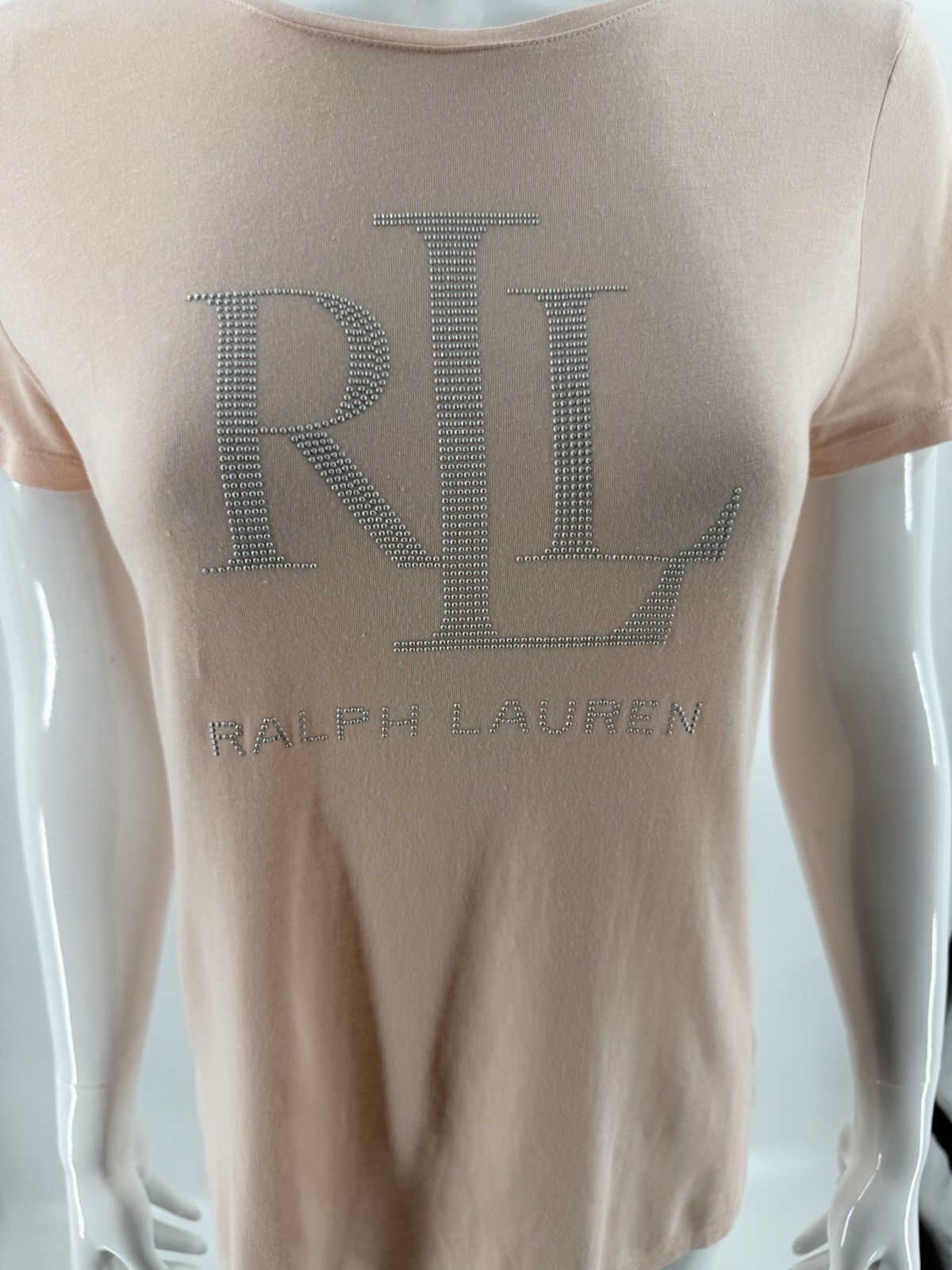 - LRL Ralph Lauren Top Womens Size Medium Pale Pink Studded Logo Tee Shirt