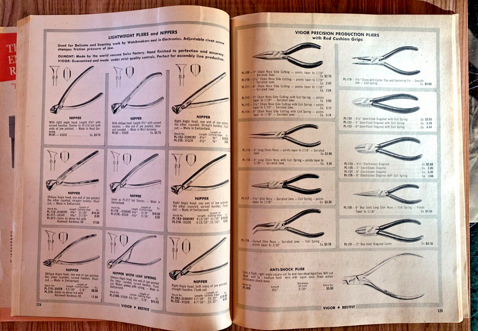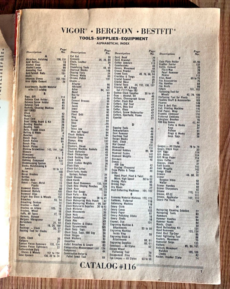 This product is a 1969 price guide titled "Vigor, Bergeon, Bestfit Tools, Equip. for Precision Industries Catalog No. 116." by S. LaRose, focusing on collectible clocks and watches from the 1960-1969 time period. It was published by Jadow and Sons in New York, 1969. RARE! The guide provides information on various tools and equipment used in the precision industry, specifically geared towards clock and watch collectors and enthusiasts. Additionally, the title hints at the inclusion of renowned brands such as Vigor, Bergeon, and Bestfit, offering valuable insights for those interested in this niche market. Note: Great source for naming vintage tools and equipment from the graphic illustrations. See pics for detail. [e-08]