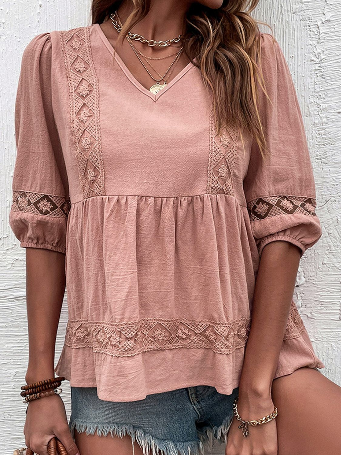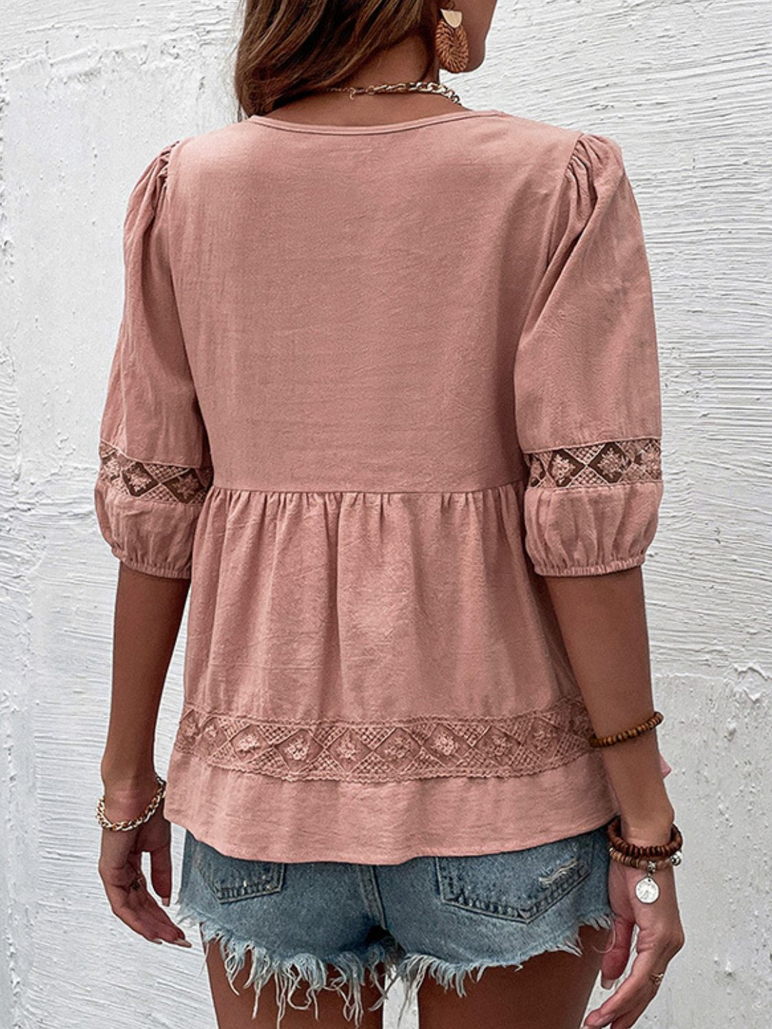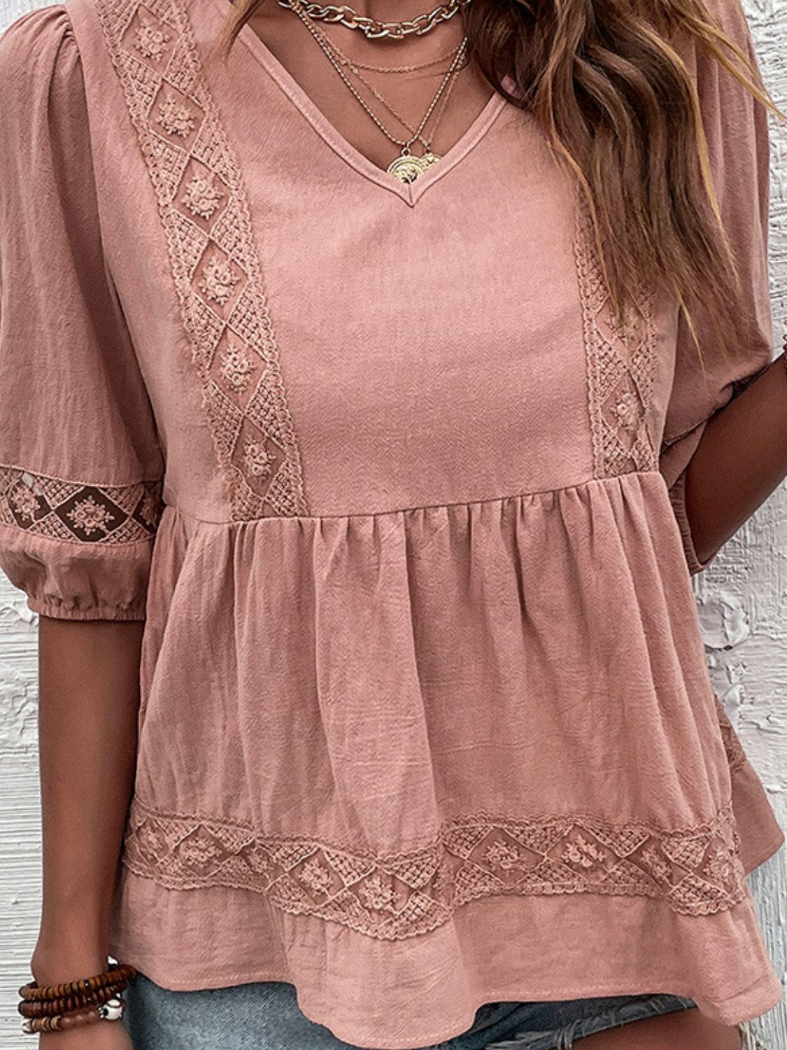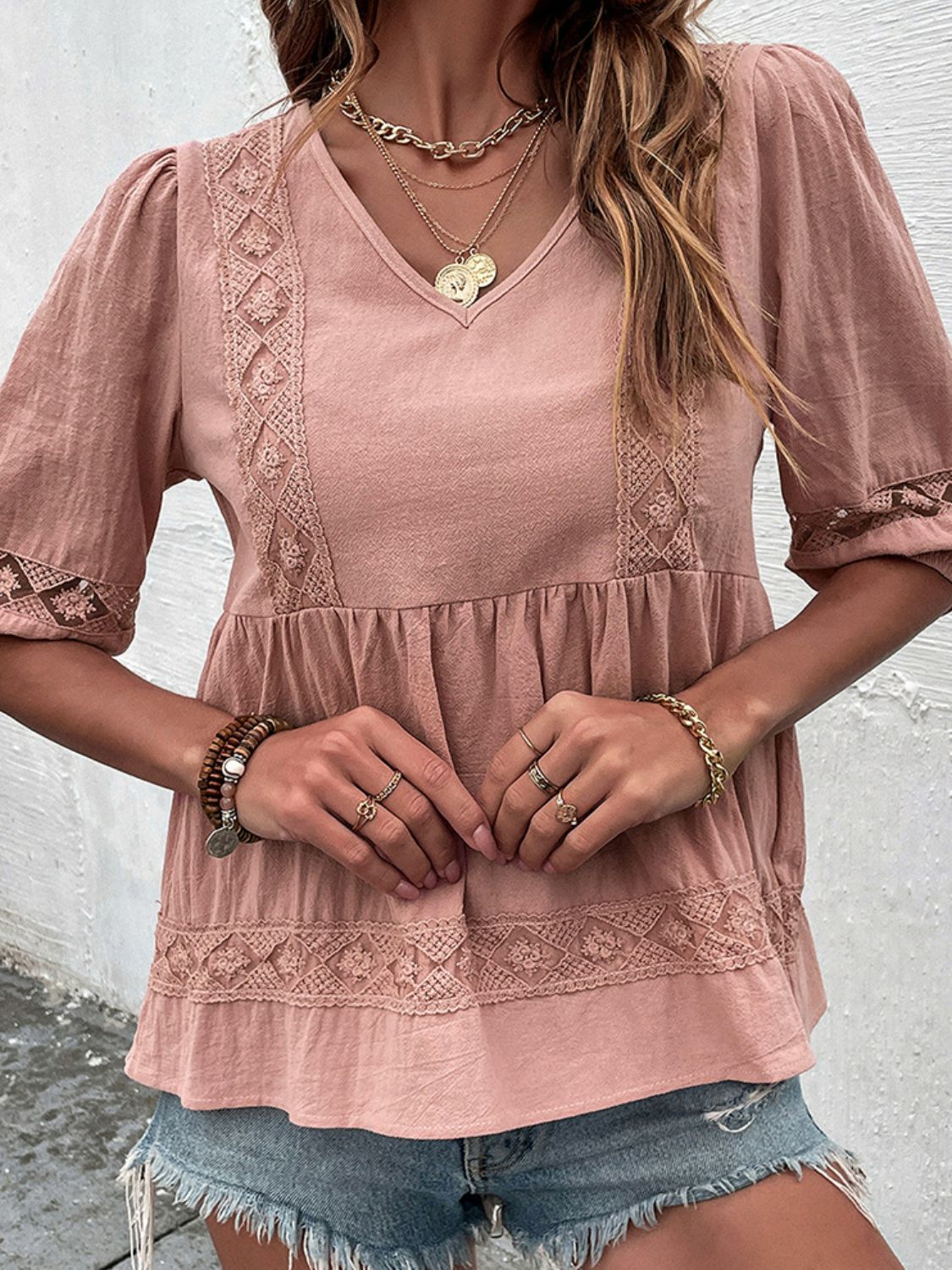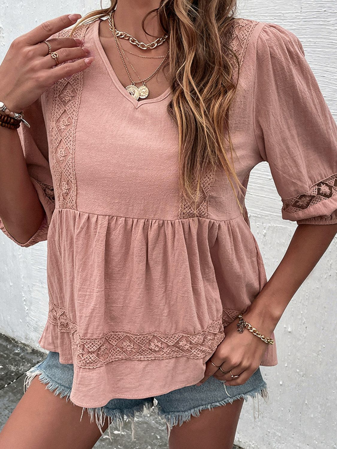 - Lace Trim V-Neck Puff Sleeve Peplum Top