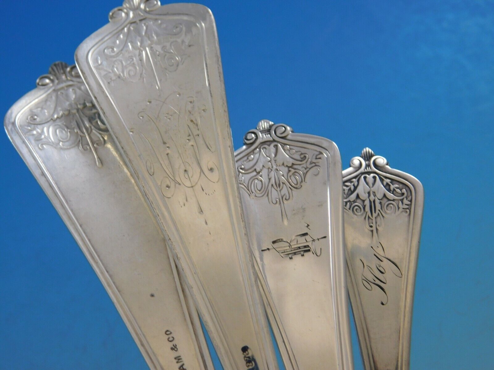 Excellent condition with various monograms on the reverse, some pieces with no monograms. This set will be lightly hand polished and sealed in individual plastic sleeves prior to shipping.
