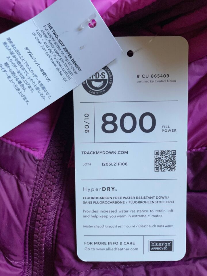 800 fill power RDS HyperDry? down
