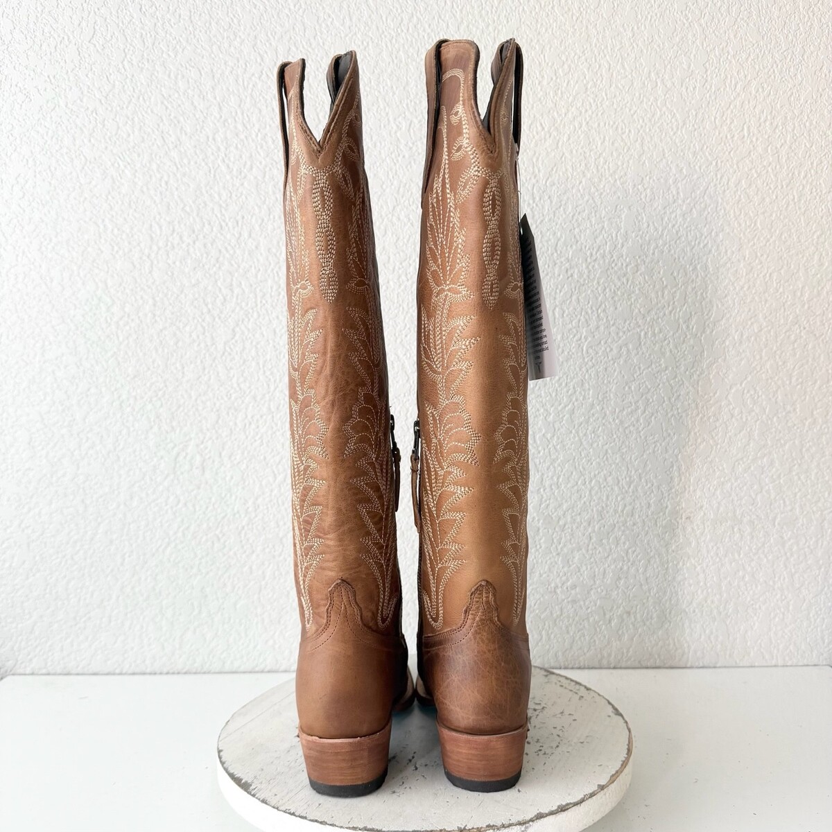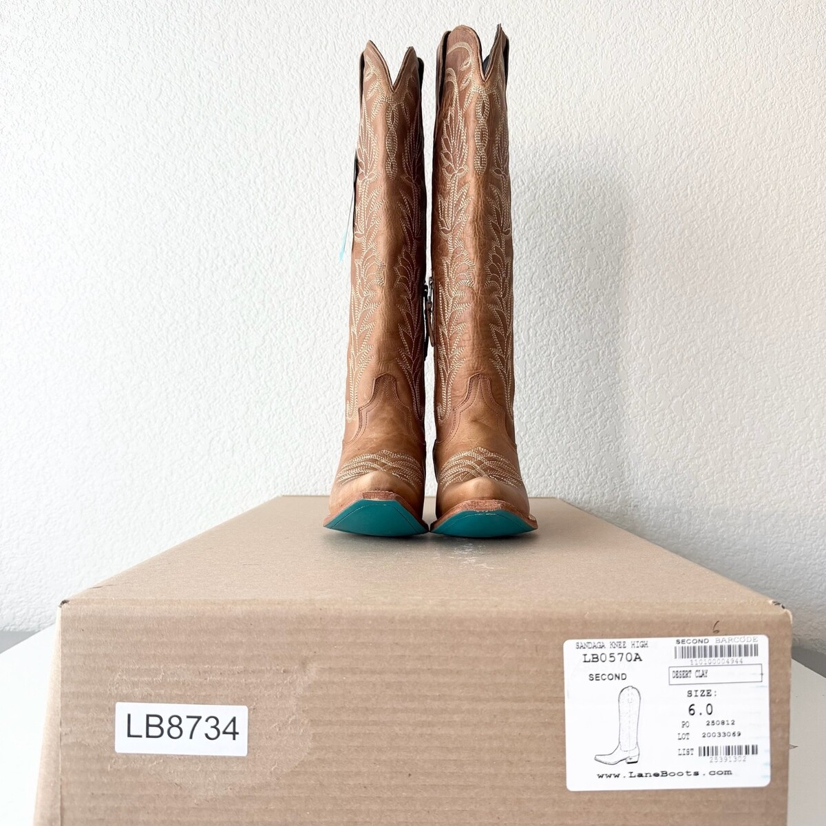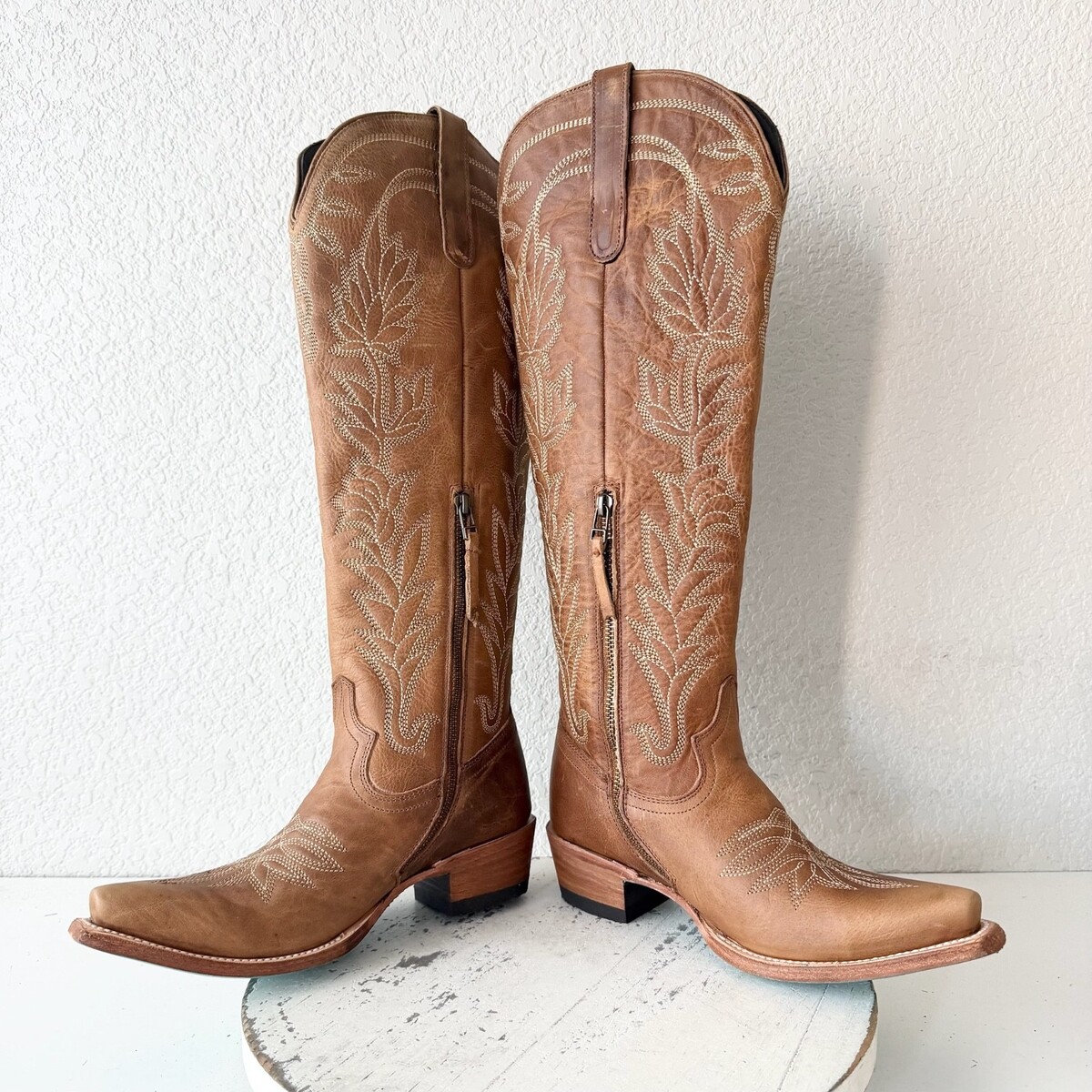 Lane SANDAGA Knee High Womens Cowboy Boots in Desert Clay Brown Leather with a Western Pointed Snip Toe and a Tall 17" Shaft Zipper Closure Condition: These are new boots. The leather is designed to have a distressed look. There is a small light spot on the right strap. They will come in a boot box and fit true to size. **The pictures of the actual boots you will receive. These are 100% leather. Knee High Tall Brand: Lane Boots Style: Sandaga Knee High Color: Desert Clay Brown Size: 6 MSRP: $450 Shaft: 17.5" Heel: 1.7" Toe Shape: Snip Toe Calf Circumference: 14" Ankle Circumference: 12" Sole Width: 3 1/2" Sole Length: 10 1/4" Shipping: I package your items with great care and ship fast from Texas. I will be listing many pairs of Cowboy Boots in all sizes - Mens and Womens.