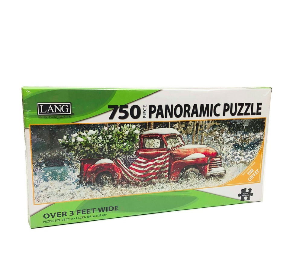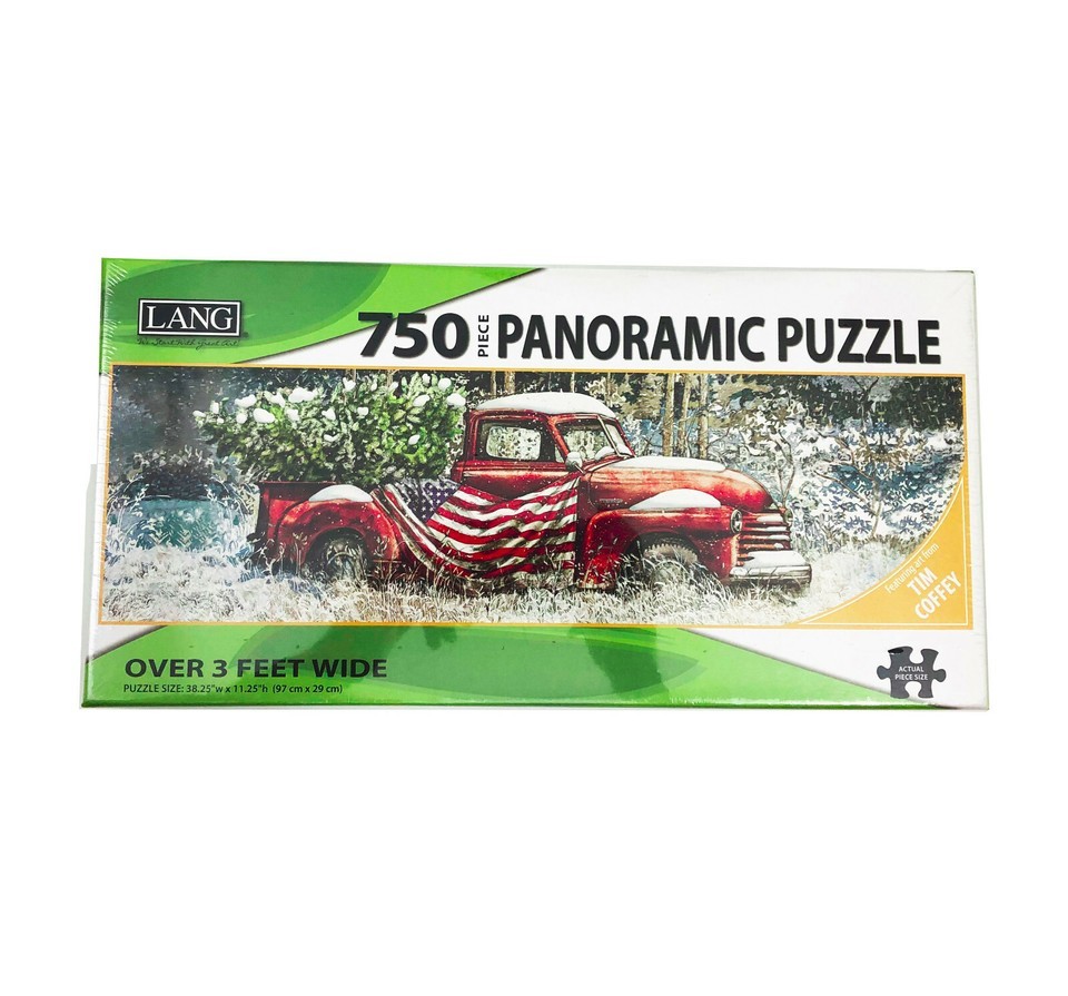 ***Make us an offer*** Patriotic and nostalgic panoramic jigsaw puzzle. 38.25 inches wide by 11.25 inches tall when finished. Older 50's era pickup truck covered with snow with a Christmas tree in the truck bed and an American flag hanging on the side. Brand Lang Made in China Art by Tim Coffey 750 pieces 35.25 x 11.25 inches when finished Great art piece for framing SKU K025
