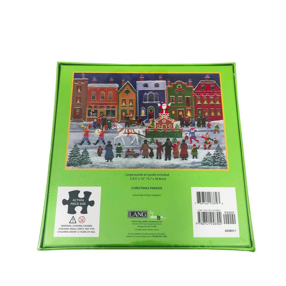 Have fun completing this nostalgic scene of a Christmas parade. Cute buildings are decorated for Christmas in the snowy scene. Families watch as a horse drawn wagon passes by with Santa Claus, an Elf and a gingerbread house. Great pastime for yourself or as a gift. When done, frame it and you'll have a piece of Mary Singleton's art work. Brand Lang Folk Art Made in China 1000 linen embossed precision cut pieces Gap free, secure locking Puzzle guide included 29" wide by 20" high when finished Art by Mary Singleton SKU K023