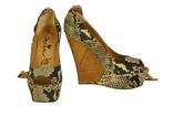 Lanvin ( Summer 2011 ) presents these high heel wedges, an ideal footwear choice for the modern woman. From the renowned fashion house, Alber Elbaz collection, comes a shoe that is simply amazing. Made from two tone snake print canvas upper, ankle ties and cork wedge heels, these shoes also feature peep toes and the ultimate impressive look!! .These stunning shoes from Lanvin can enhance any style when going out on the town. Always in fashion with this stylish pair!