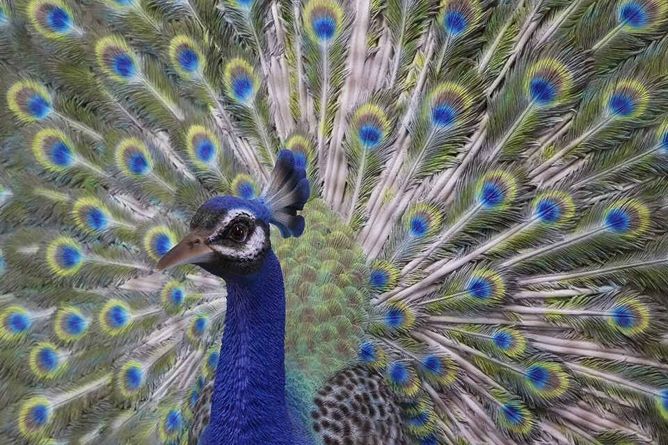 - Large Gallery Quality Male Peacock With Exotic Iridescent Train Plumage Statue