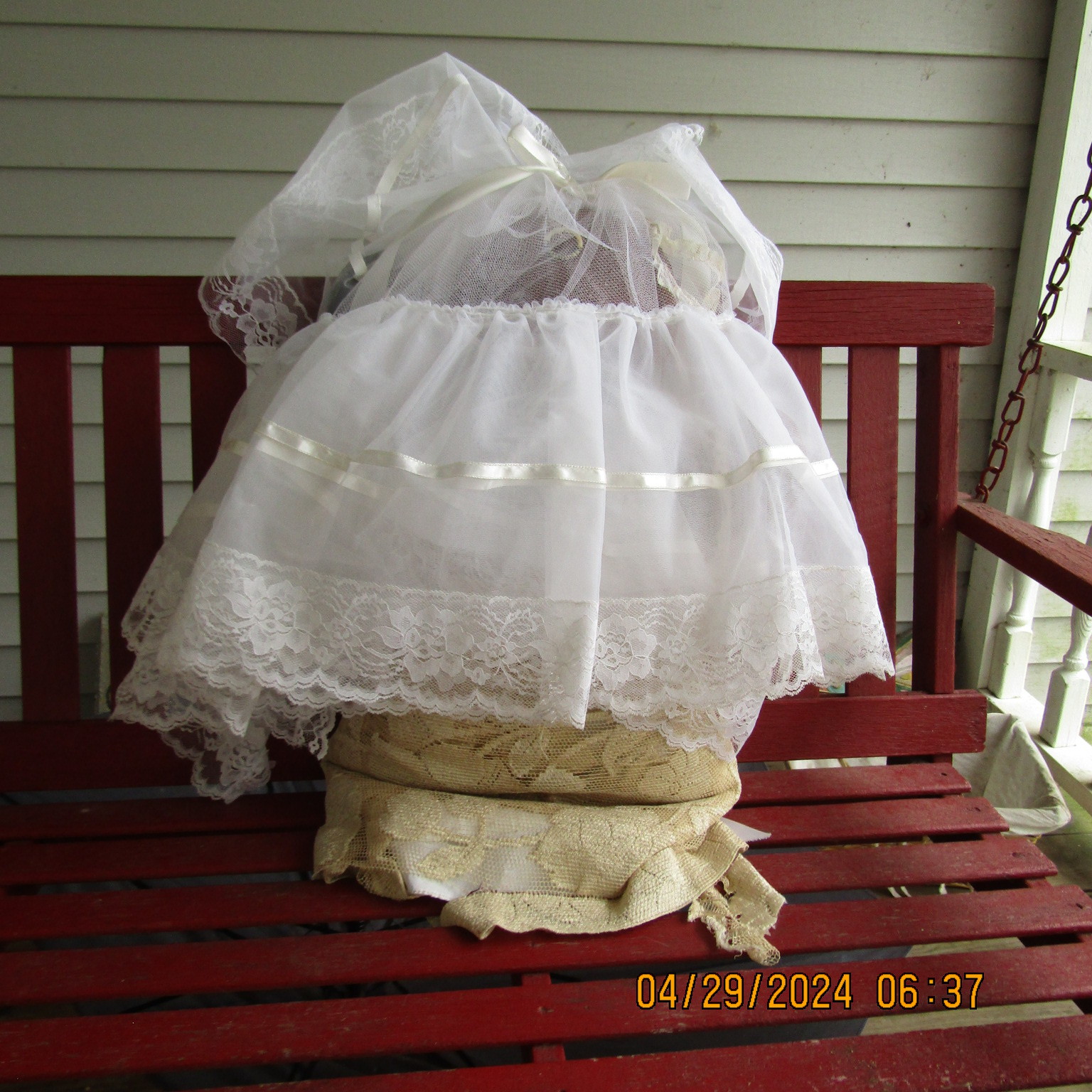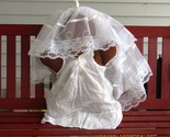 This 22" doll is great for you or someone you know who is forced into a marriage she didn't/doesn't want. Keep in the room with you to instill coinfidence in yourself, so eventually you can either take a stand against the patriarchal partner youre stuck with OR possibly get out (whicheer you want). 22" tall, this is a very big gingerbread person-style doll. There's something new (an Amazon necklace), something old (pretty much everything), something blue (silk flower). There's a pocket for something borrowed (I put the stem of a bolt in there, jsut in case you couldn't find anything else). The pocket is on the inside slip. The veil is made from an old wedding dress a friend bought for me at Auction. The outer dress is made from the curtains of an estate my friend gave me. The slip was given to me by another friend who was cleaning out her craft room.There is some necklaces and pins included on the doll. You get a lot of extras on this doll. CUTE CUTE CUTE. The veil has a blusher. Many layers. LOCATION: Car for vendor shows.