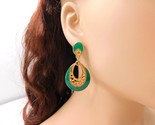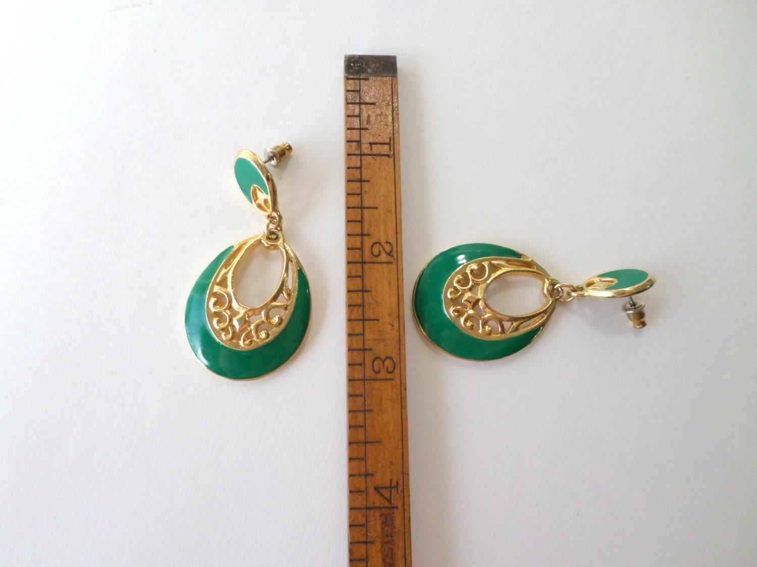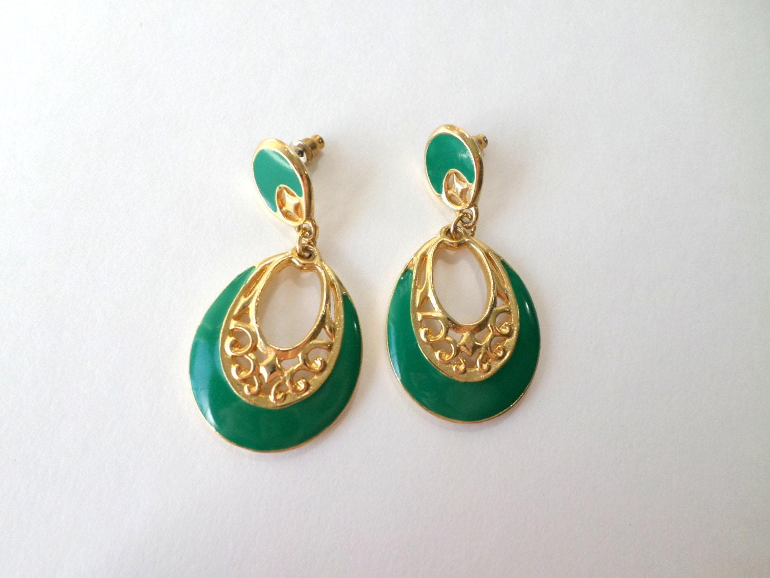 ?Style/Features: Oval enamel drops framed with gold filigree with a round green enamel that sits on the ear, comfortable for all day wear. Perfect with maxi dresses.