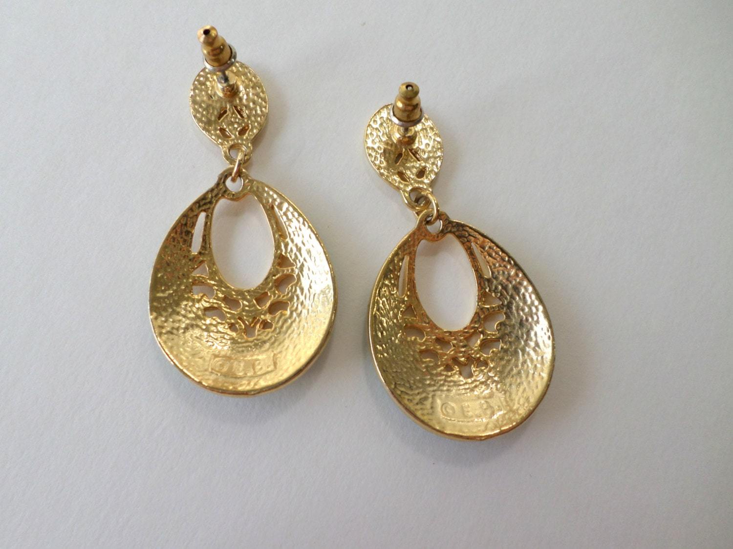 Large Green Oval Drop Earrings, Signed Gold Filigree