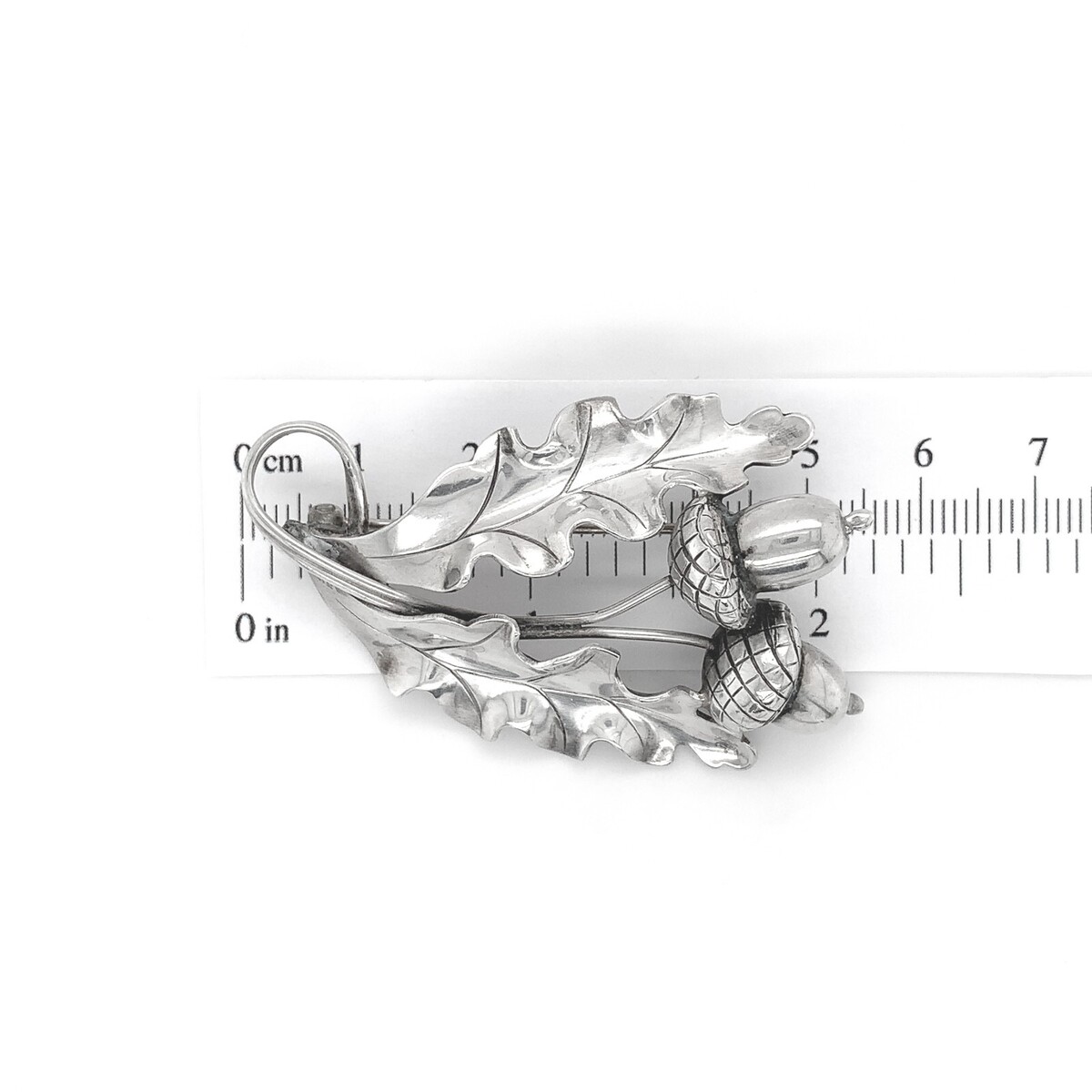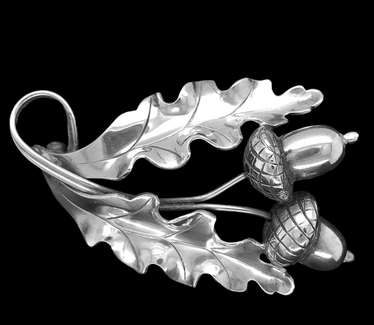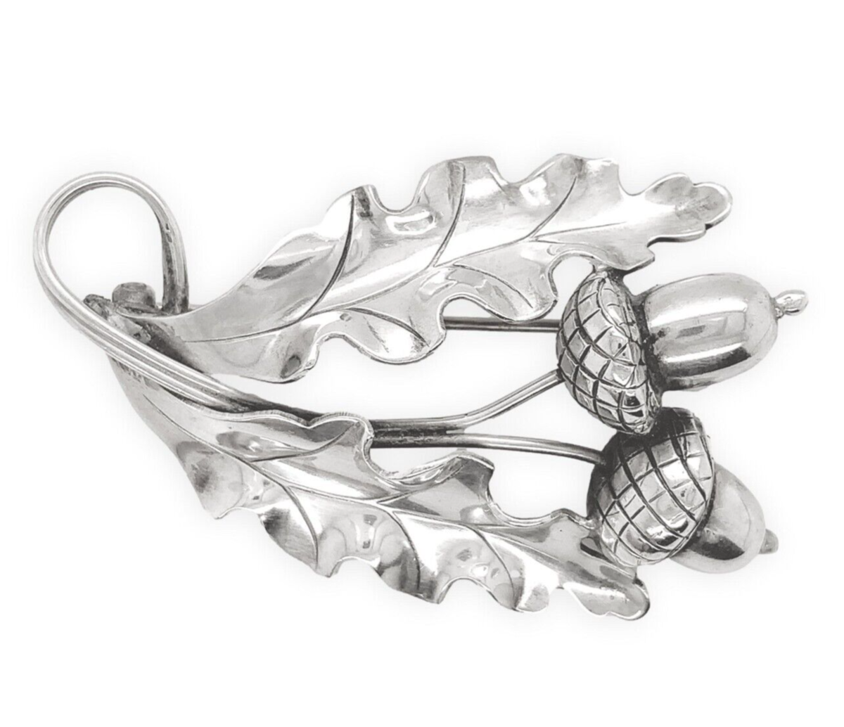 Large handwrought sterling pin #128 made by International and designed by Alphonse La Paglia. Retailed by the Georg Jensen store in the USA. There are two acorns and two oak leaves. It measures 2 1/4" x 1 3/8", it weighs 7.74 dwt., and dates from the 1940-50s. Absolutely beautiful!