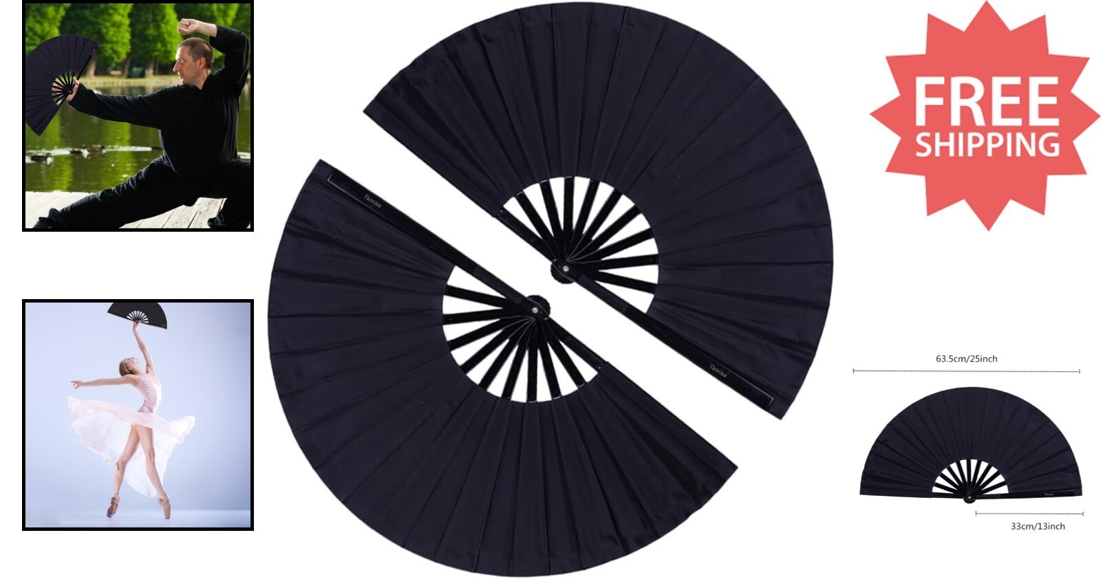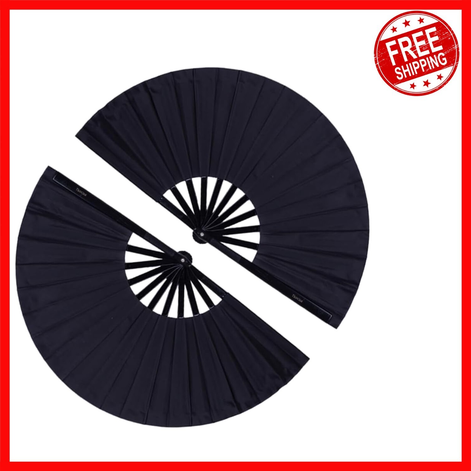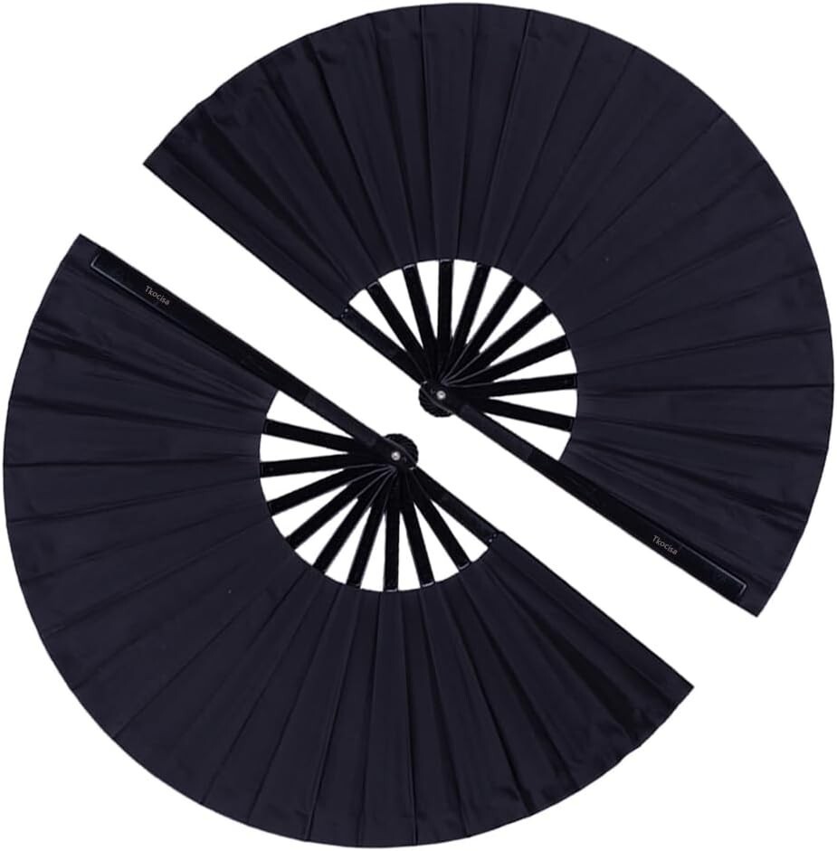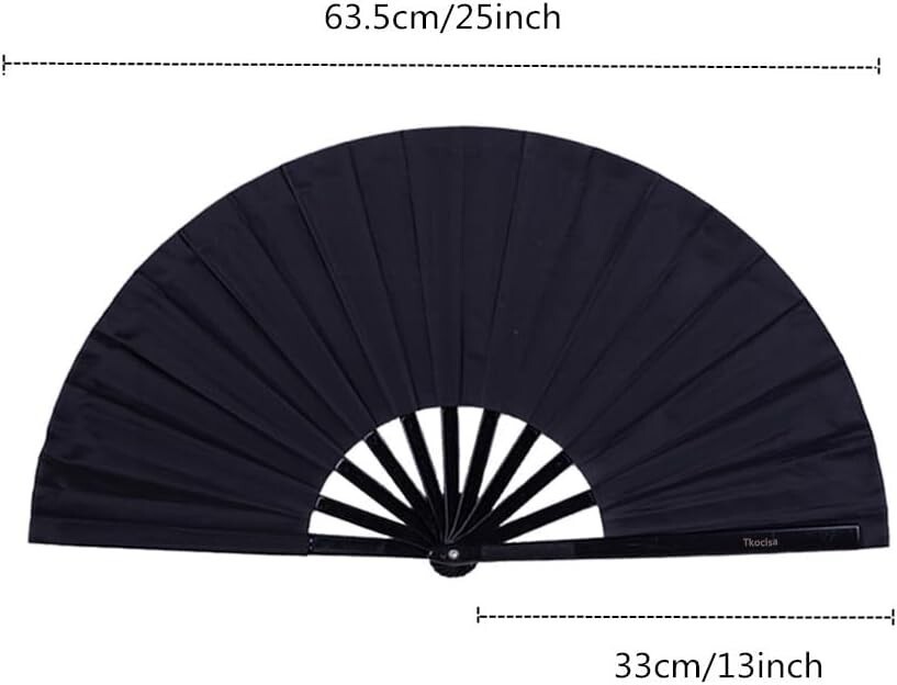 Stay cool and stylish with our set of two large black folding fans, crafted from durable plastic and lightweight nylon cloth. Each fan measures approximately 33 x 63.5 cm (13 x 25 inches), making them easy to hold or carry in your bag. Effortlessly open the fans with a gentle flick, creating a satisfying loud sound at high speed, perfect for making a statement at parties, festivals, or performances. Ideal for dance, Halloween, Christmas, or as a thoughtful gift, these foldable fans are versatile and practical for everyday or special occasions. Enhance your events or personal collection with this elegant, functional accessory.